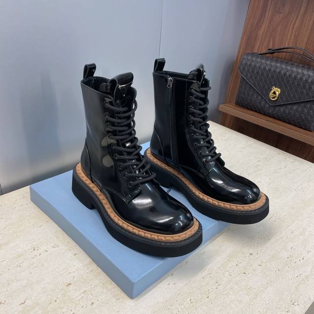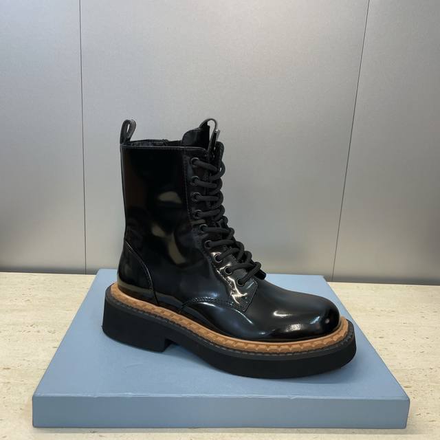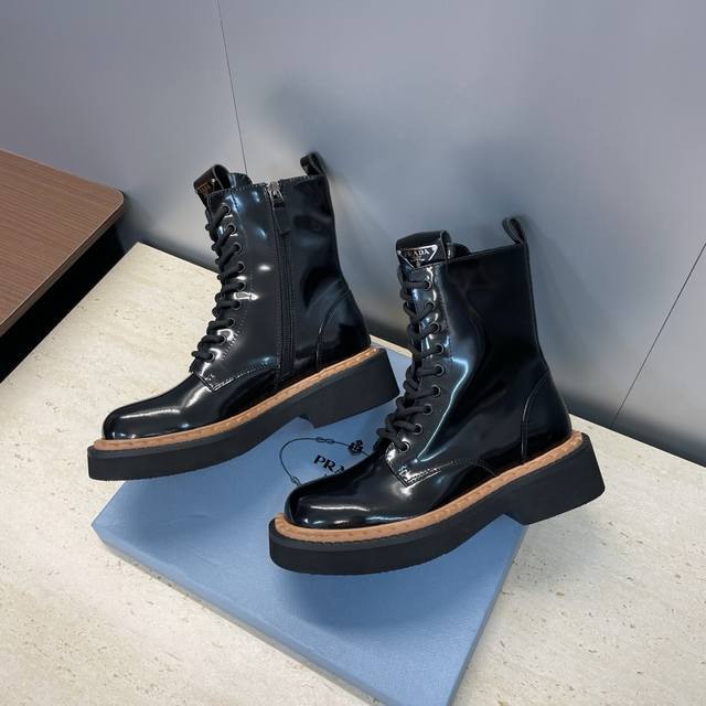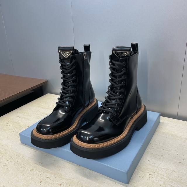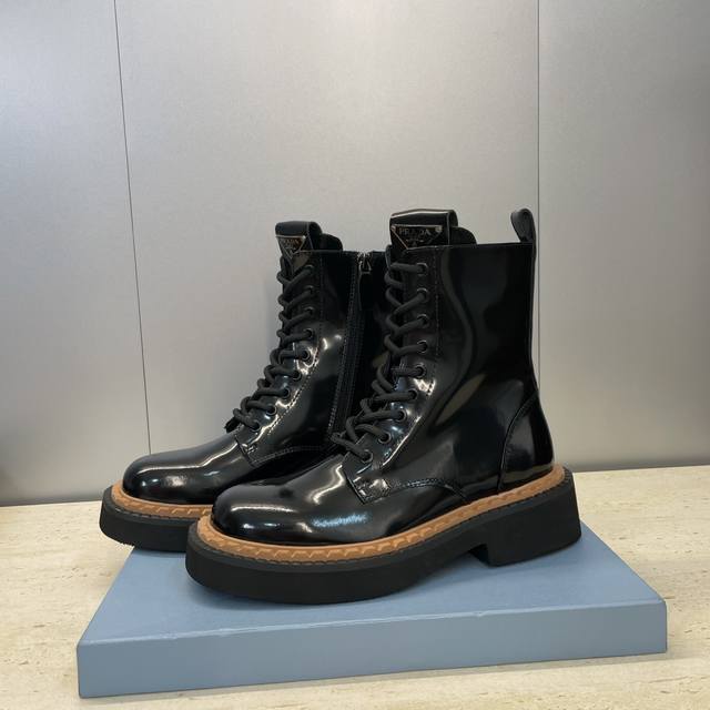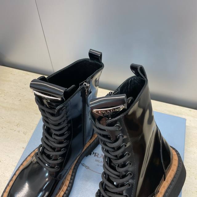 工厂P价P Prada 普拉达 2025秋冬新款朋克风格侧拉链低跟机车女短靴 明星同款厚底圆头标志性字母Logo三角徽章系带拼色骑士军靴 市面顶级高端版本 材质:鞋面进口牛猄皮 进口小牛皮 进口开边珠牛皮+水染羊皮内里+原版开模大底 跟高:3Cm Size: 35-39 40.41定做不退不换