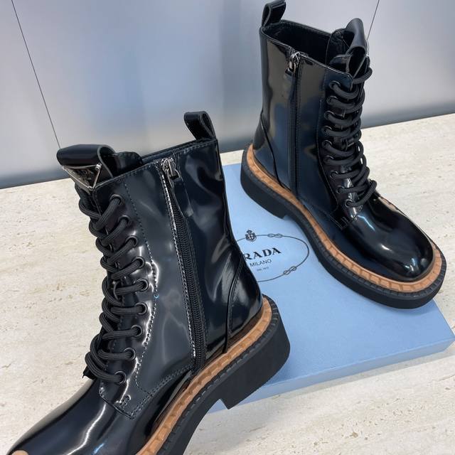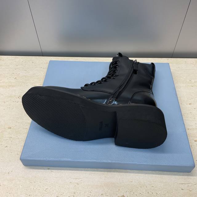 工厂P价P Prada 普拉达 2025秋冬新款朋克风格侧拉链低跟机车女短靴 明星同款厚底圆头标志性字母Logo三角徽章系带拼色骑士军靴 市面顶级高端版本 材质