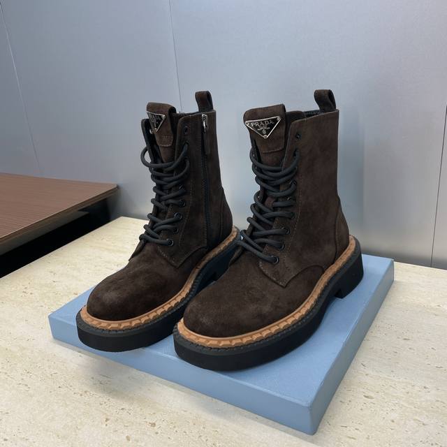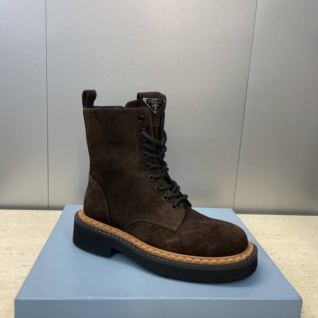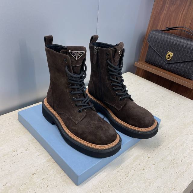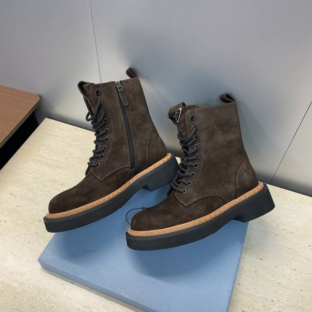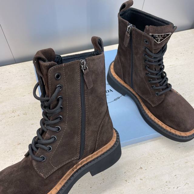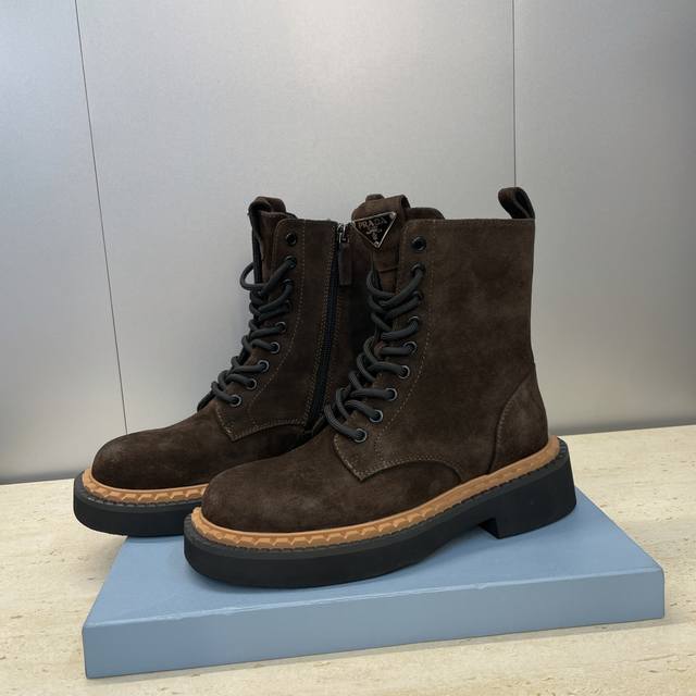 工厂P价P Prada 普拉达 2025秋冬新款朋克风格侧拉链低跟机车女短靴 明星同款厚底圆头标志性字母Logo三角徽章系带拼色骑士军靴 市面顶级高端版本 材质:鞋面进口牛猄皮 进口小牛皮 进口开边珠牛皮+水染羊皮内里+原版开模大底 跟高:3Cm Size: 35-39 40.41定做不退不换