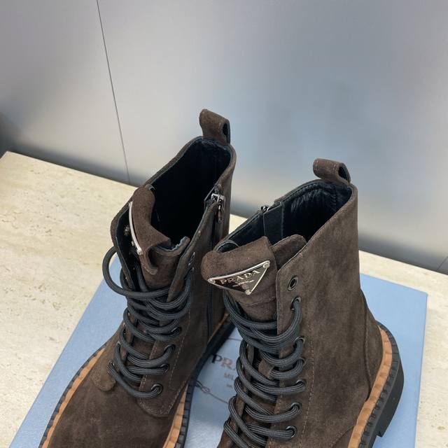工厂P价P Prada 普拉达 2025秋冬新款朋克风格侧拉链低跟机车女短靴 明星同款厚底圆头标志性字母Logo三角徽章系带拼色骑士军靴 市面顶级高端版本 材质