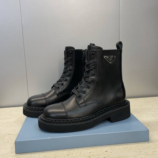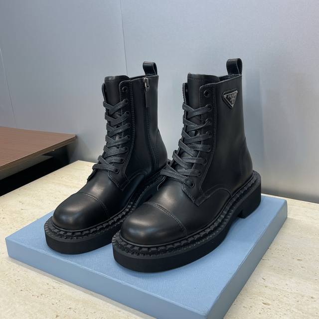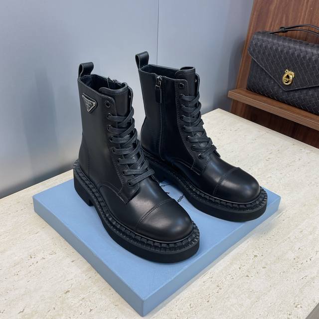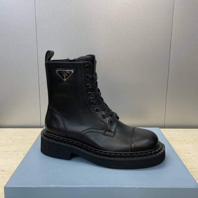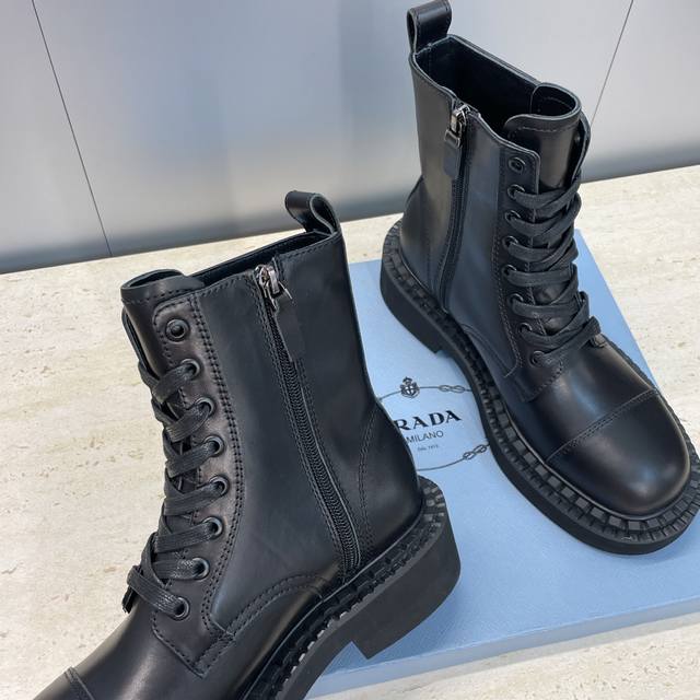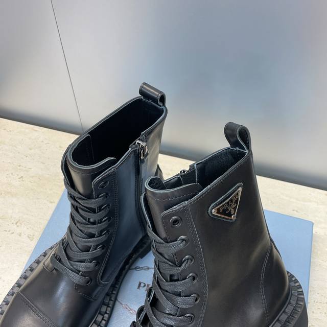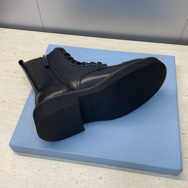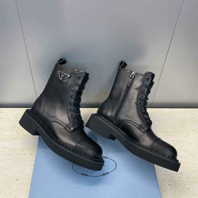 工厂P价P Prada 普拉达 2025秋冬新款朋克风格侧拉链低跟机车女短靴 明星同款厚底圆头标志性字母Logo三角徽章系带骑士军靴 市面顶级高端版本 材质:鞋面进口牛猄皮 进口小牛皮 进口开边珠牛皮+水染羊皮内里+原版开模大底 跟高:3Cm Size: 35-39 40.41定做不退不换