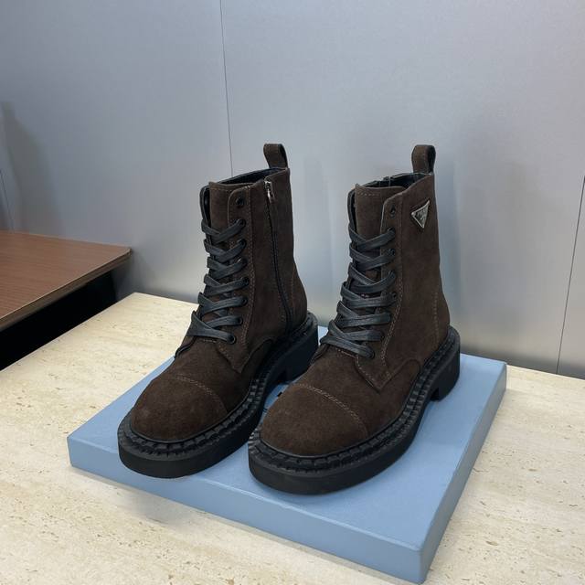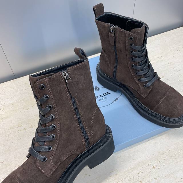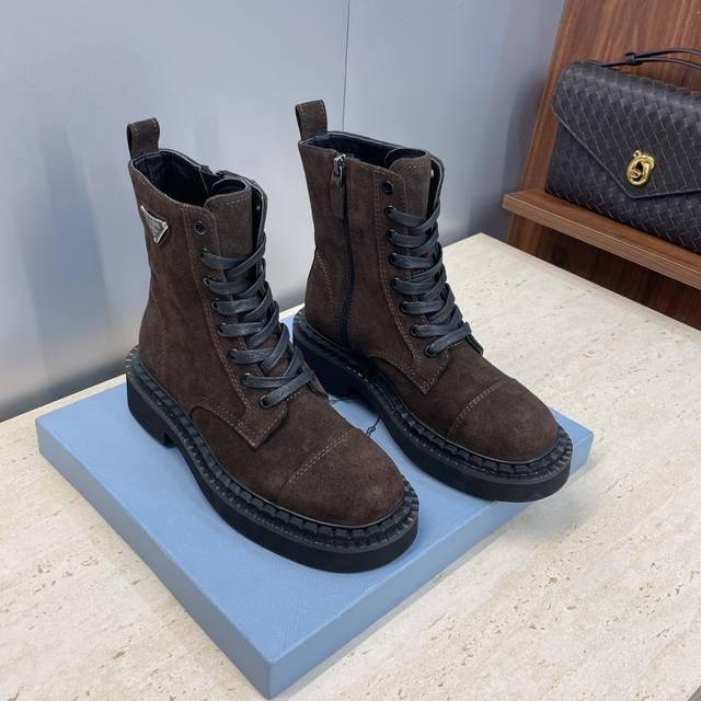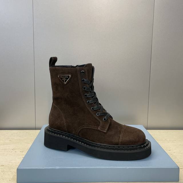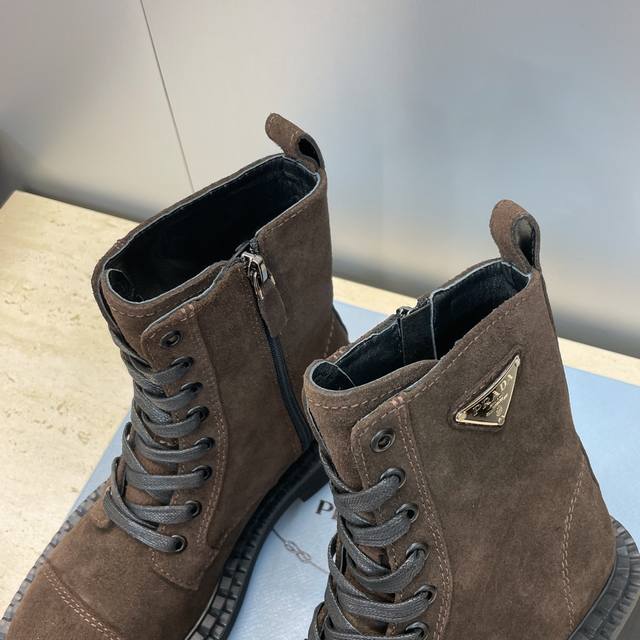 / 工厂P价P Prada 普拉达 2025秋冬新款朋克风格侧拉链低跟机车女短靴 明星同款厚底圆头标志性字母Logo三角徽章系带骑士军靴 市面顶级高端版本 材质:鞋