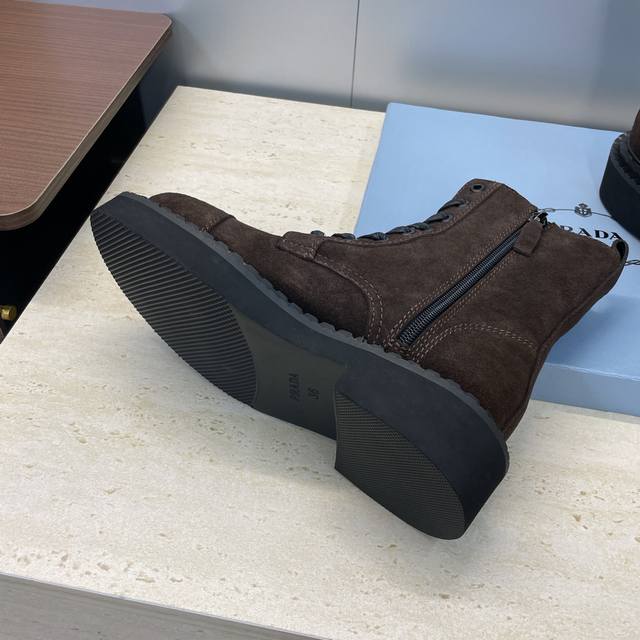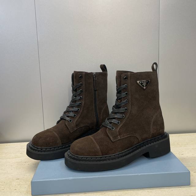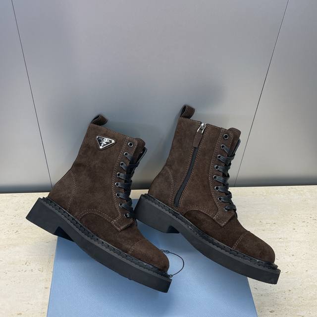 工厂P价P Prada 普拉达 2025秋冬新款朋克风格侧拉链低跟机车女短靴 明星同款厚底圆头标志性字母Logo三角徽章系带骑士军靴 市面顶级高端版本 材质:鞋面进口牛猄皮 进口小牛皮 进口开边珠牛皮+水染羊皮内里+原版开模大底 跟高:3Cm Size: 35-39 40.41定做不退不换
