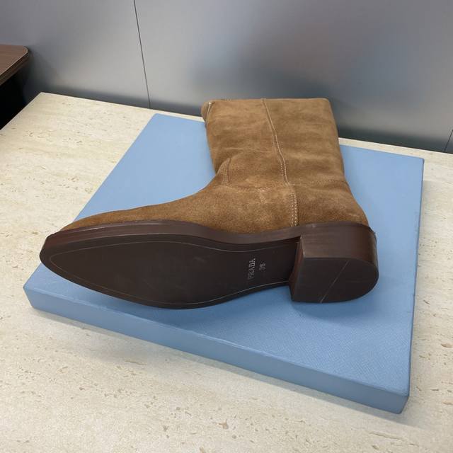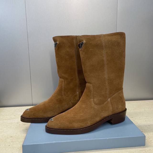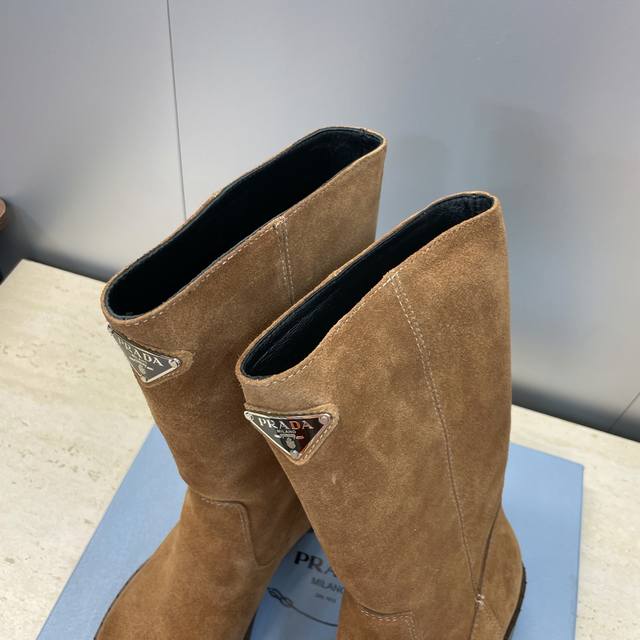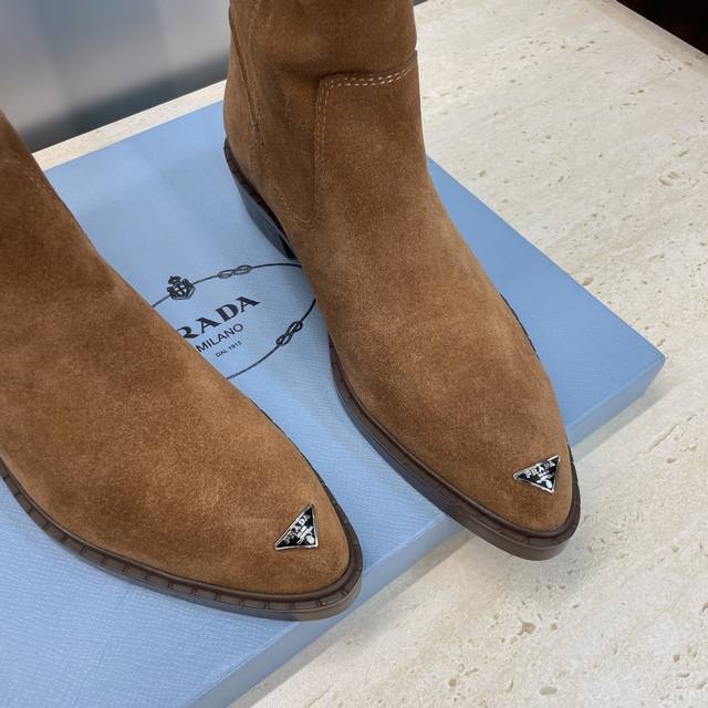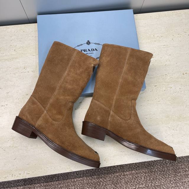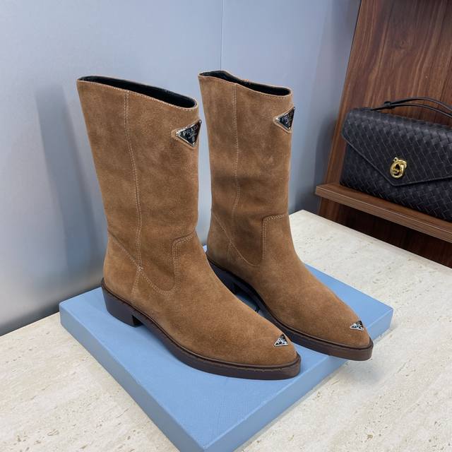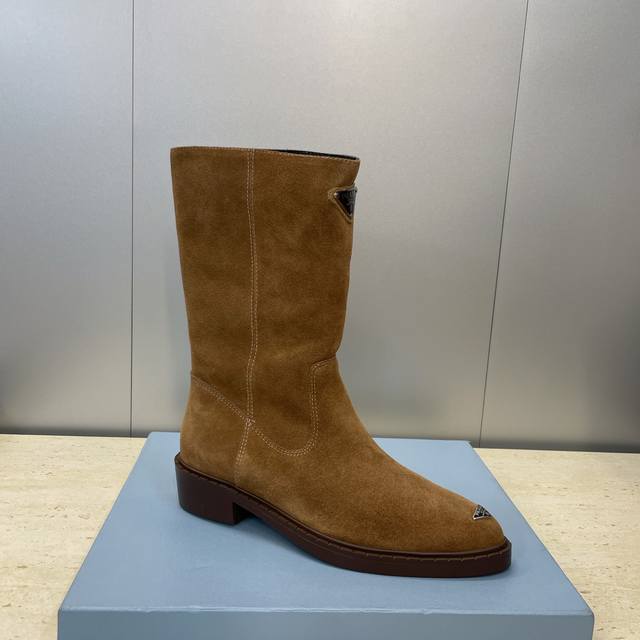 / 工厂P价P Prada 普拉达 2025秋冬新款游牧风格中筒机车女短靴 明星同款低跟尖头标志性字母Logo三角徽章一脚蹬马丁骑士军靴 市面顶级高端版本 材质:鞋