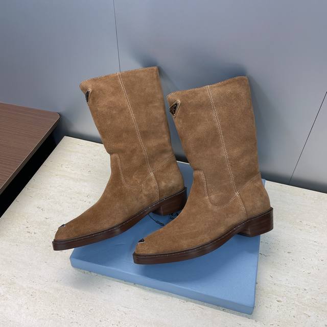 工厂P价P Prada 普拉达 2025秋冬新款游牧风格中筒机车女短靴 明星同款低跟尖头标志性字母Logo三角徽章一脚蹬马丁骑士军靴 市面顶级高端版本 材质:鞋面进口牛猄皮 进口小牛皮 进口开边珠牛皮+水染羊皮内里+原版开模大底 跟高:2.5Cm Size: 35-39 40.41定做不退不换