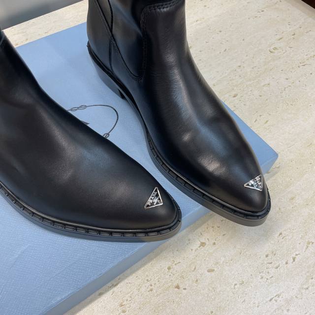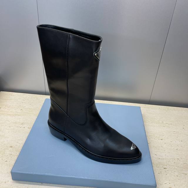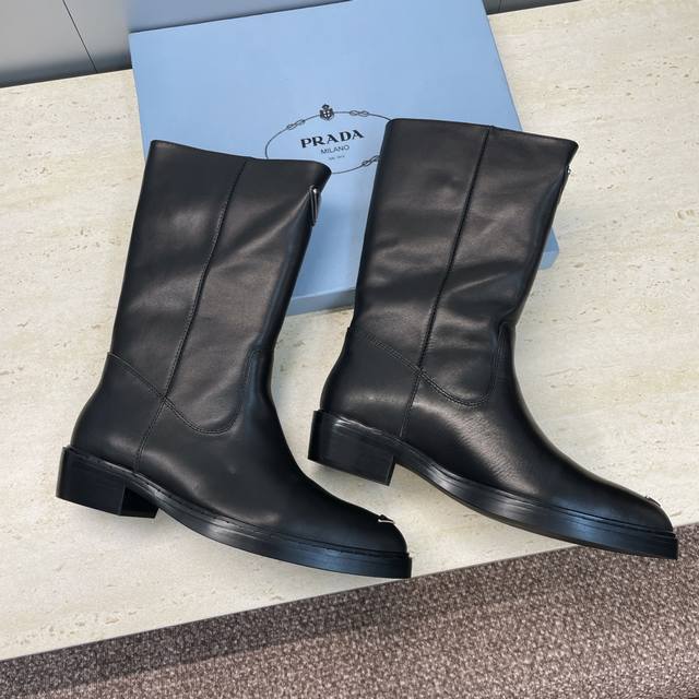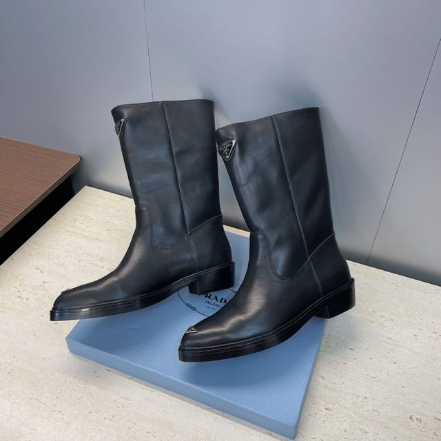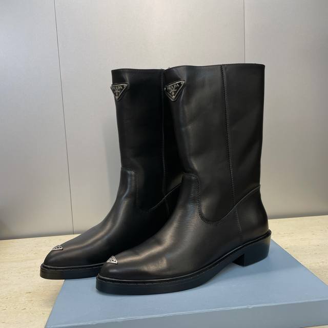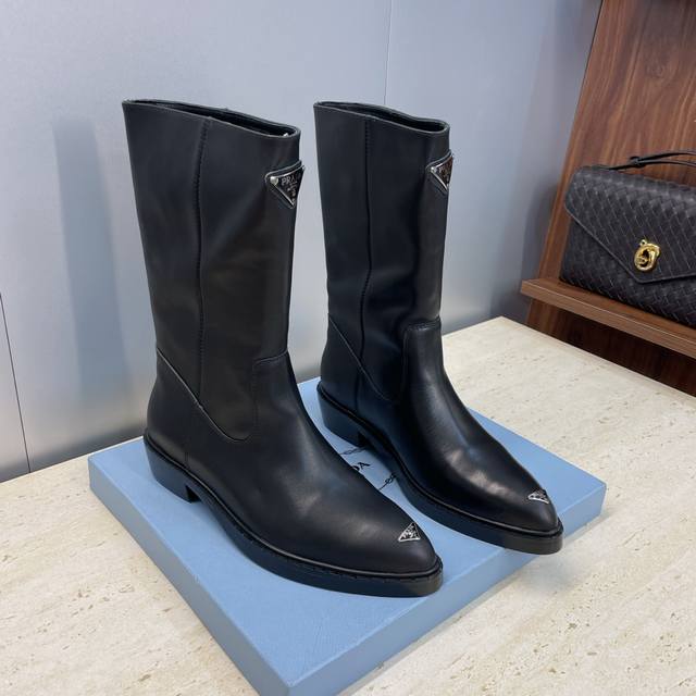 工厂P价P Prada 普拉达 2025秋冬新款游牧风格中筒机车女短靴 明星同款低跟尖头标志性字母Logo三角徽章一脚蹬马丁骑士军靴 市面顶级高端版本 材质:鞋面进口牛猄皮 进口小牛皮 进口开边珠牛皮+水染羊皮内里+原版开模大底 跟高:2.5Cm Size: 35-39 40.41定做不退不换