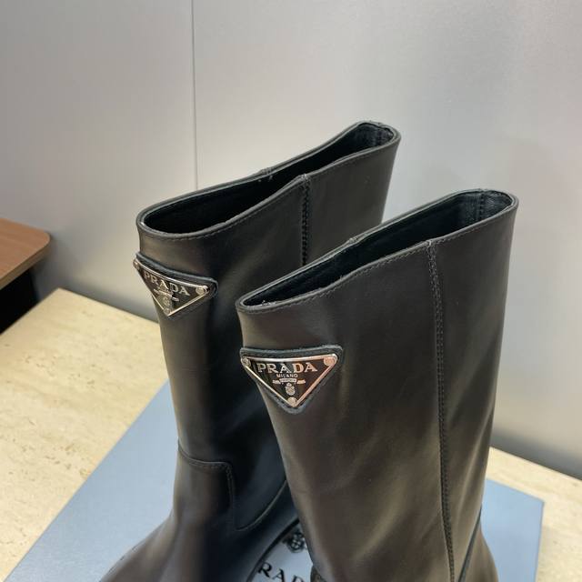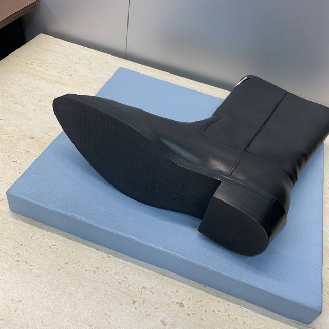 / 工厂P价P Prada 普拉达 2025秋冬新款游牧风格中筒机车女短靴 明星同款低跟尖头标志性字母Logo三角徽章一脚蹬马丁骑士军靴 市面顶级高端版本 材质:鞋
