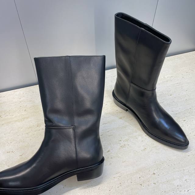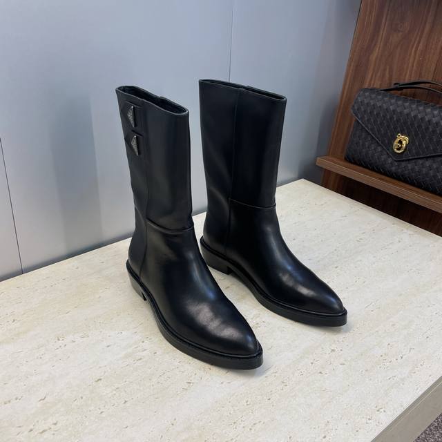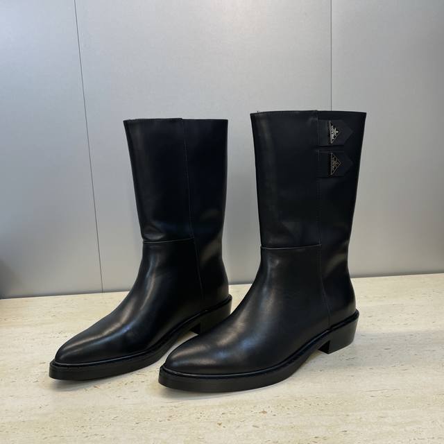 工厂P价P Prada 普拉达 2025秋冬新款游牧风格中筒机车女短靴 明星同款朋克风格低跟尖头标志性字母Logo三角徽章一脚蹬马丁骑士军靴 市面顶级高端版本 材质:鞋面进口小牛皮 进口开边珠牛皮+水染羊皮内里+原版开模大底 跟高:2.5Cm Size: 35-39 40.41定做不退不换