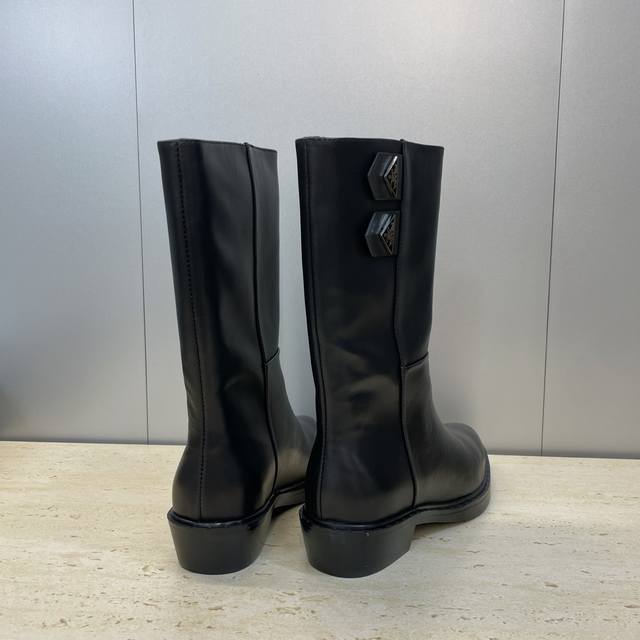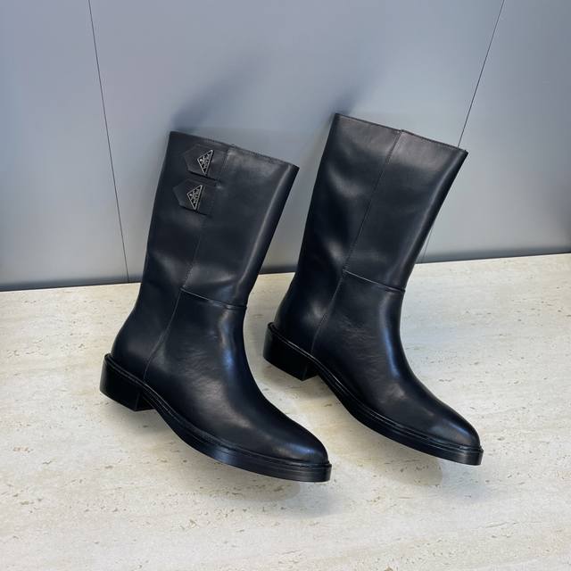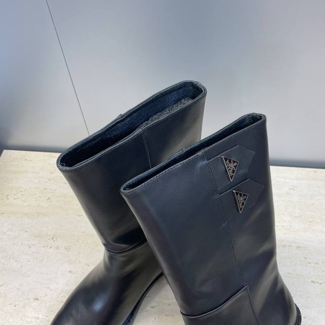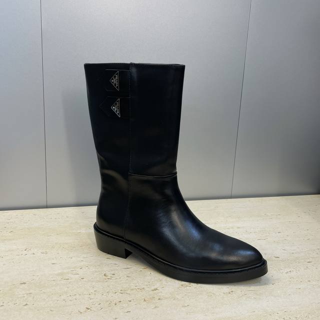 工厂P价P Prada 普拉达 2025秋冬新款游牧风格中筒机车女短靴 明星同款朋克风格低跟尖头标志性字母Logo三角徽章一脚蹬马丁骑士军靴 市面顶级高端版本