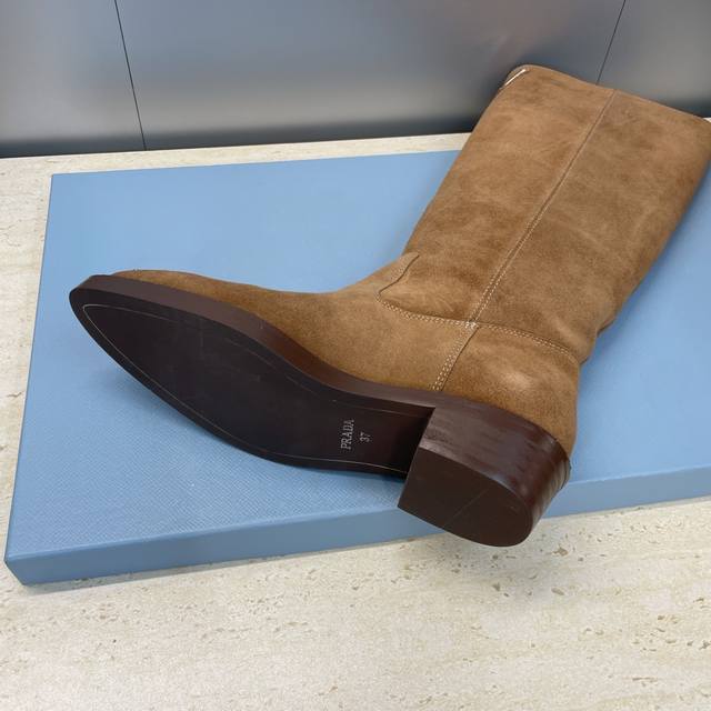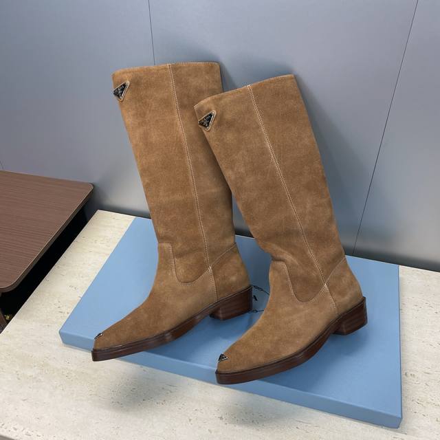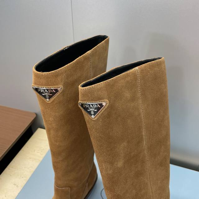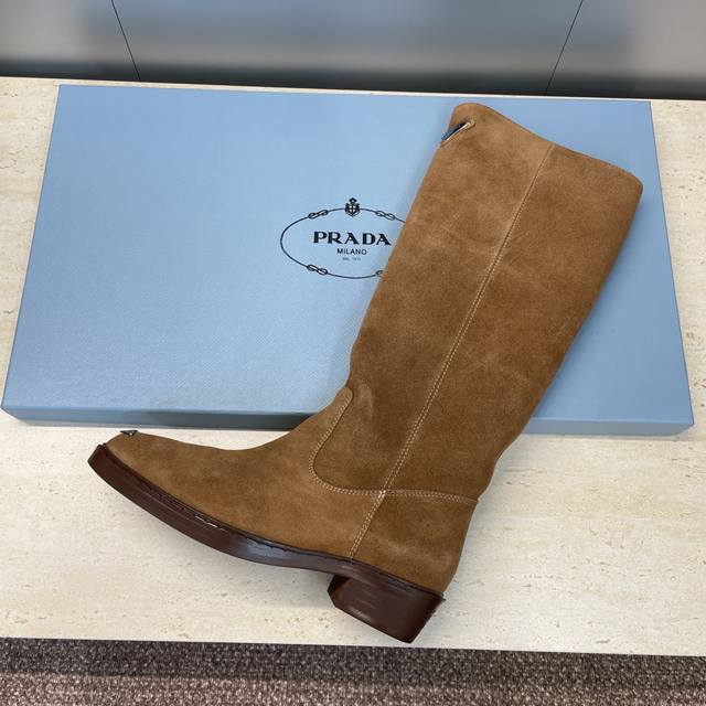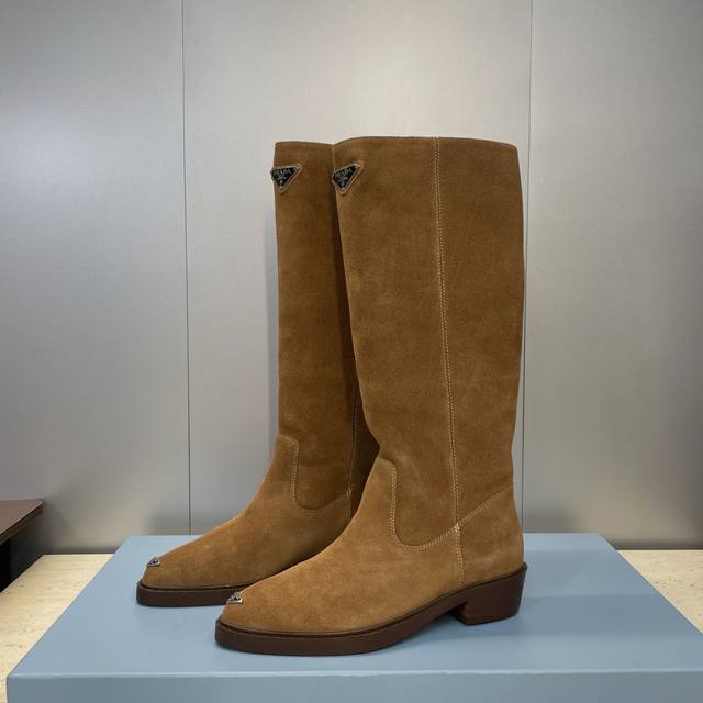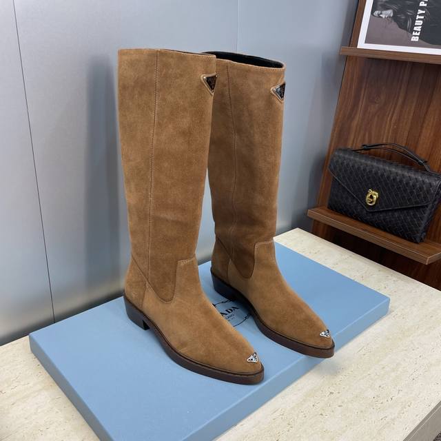 工厂P价P Prada 普拉达 2025秋冬新款游牧风格高筒及膝机车女长靴 明星同款低跟尖头标志性字母Logo三角徽章一脚蹬马丁骑士军靴 市面顶级高端版本 材质:鞋面进口牛猄皮 进口小牛皮 进口开边珠牛皮+水染羊皮内里+原版开模大底 跟高:2.5Cm Size: 35-39 40.41定做不退不换