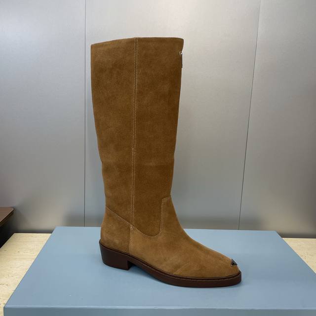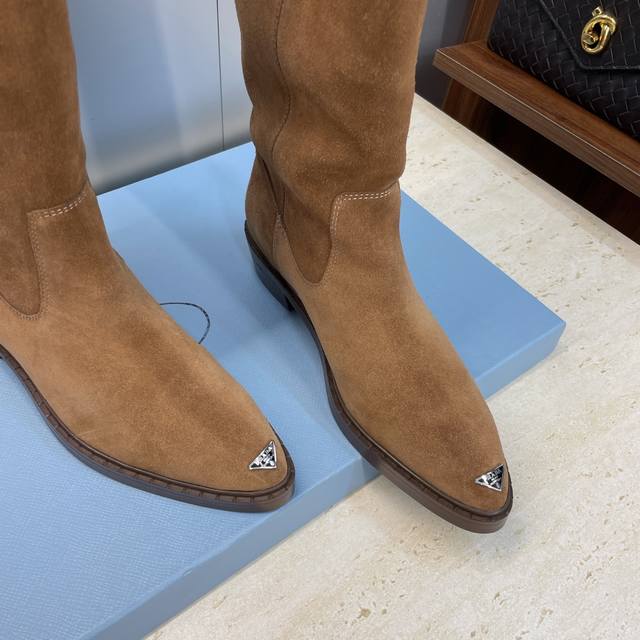 / 工厂P价P Prada 普拉达 2025秋冬新款游牧风格高筒及膝机车女长靴 明星同款低跟尖头标志性字母Logo三角徽章一脚蹬马丁骑士军靴 市面顶级高端版本 材质