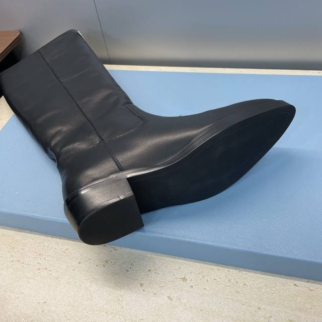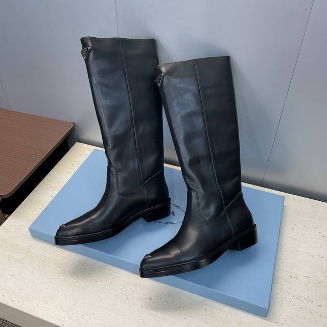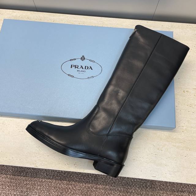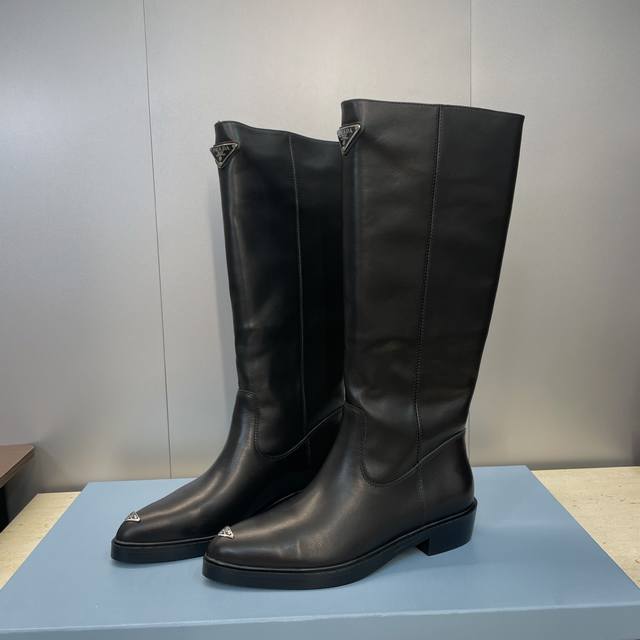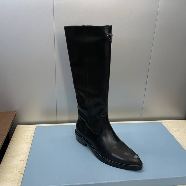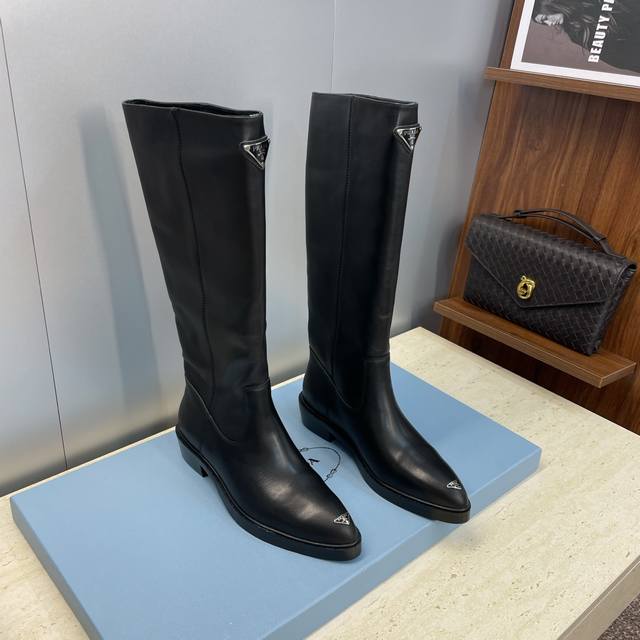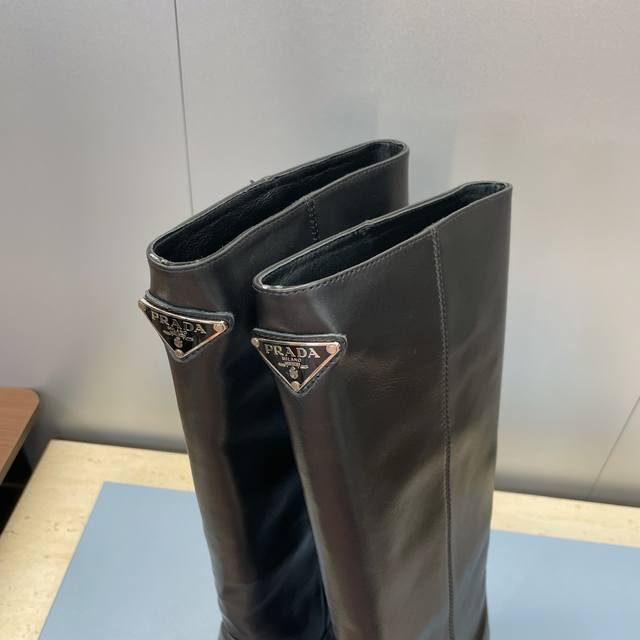工厂P价P Prada 普拉达 2025秋冬新款游牧风格高筒及膝机车女长靴 明星同款低跟尖头标志性字母Logo三角徽章一脚蹬马丁骑士军靴 市面顶级高端版本 材质:鞋面进口牛猄皮 进口小牛皮 进口开边珠牛皮+水染羊皮内里+原版开模大底 跟高:2.5Cm Size: 35-39 40.41定做不退不换