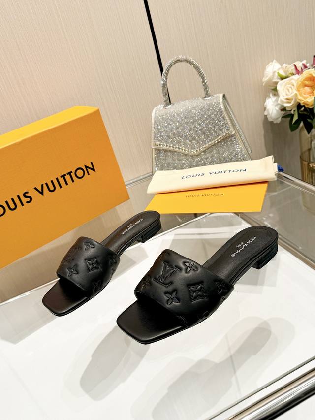 工厂P批P: 、 代购级 、Louis Vuitton 款官网系列拖鞋、完美楦型、Lv最新压花电绣纹工艺、更显优雅气质、上脚舒适好看、时尚百搭、新原版倒模楦型,极致1:1形体,做工精致、进口高端面料呈现出精致质感! 面料:进口小羊皮、内里优质柔软羊皮里、 垫脚:进口山羊皮、 意大利真皮大底 1.5面皮包跟 码数:34-41 34.41定制不退不换