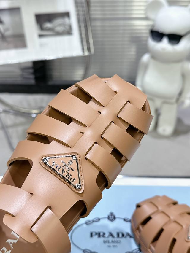 平底款 Prada 普拉达 春夏新款凉鞋系列 经典三角扣猪笼凉鞋 经典升级 舒适度与时髦度并存 圆头设计搭配不同风格需求 鞋面:原版定制材质切 羊皮 垫脚 大底