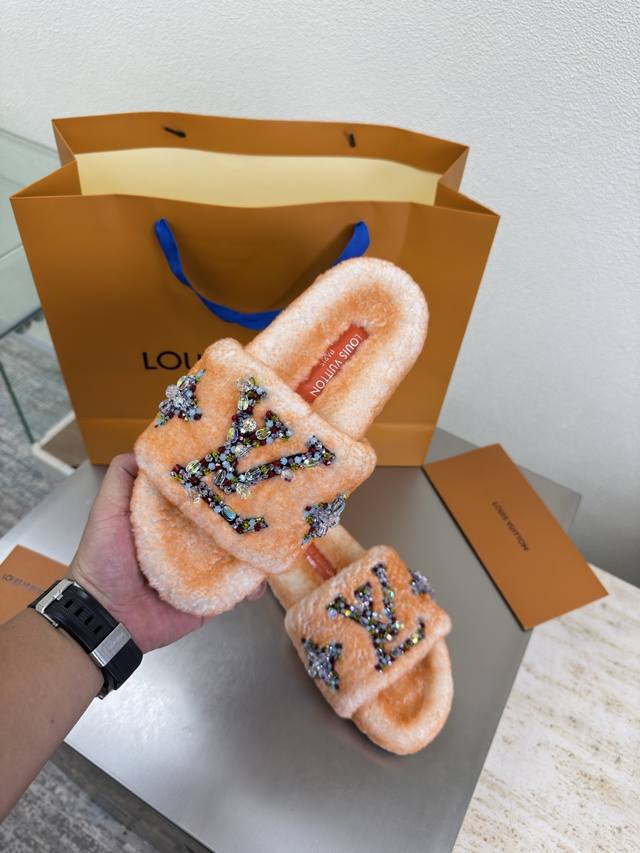 / 彩色钻石Logo 手工缝制 双色羊羔毛拖鞋 进口羊羔毛拖鞋 L驴超高性价比 包装 高品质 无瑕疵 5种配色 橘色羊羔毛 钻石手工缝制 Logo Lv 打造 使得