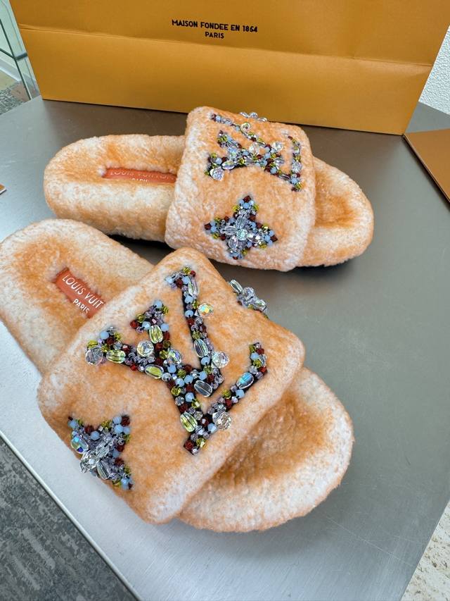 彩色钻石Logo 手工缝制 双色羊羔毛拖鞋 进口羊羔毛拖鞋 L驴超高性价比 包装 高品质 无瑕疵 5种配色 橘色羊羔毛 钻石手工缝制 Logo Lv 打造 使得