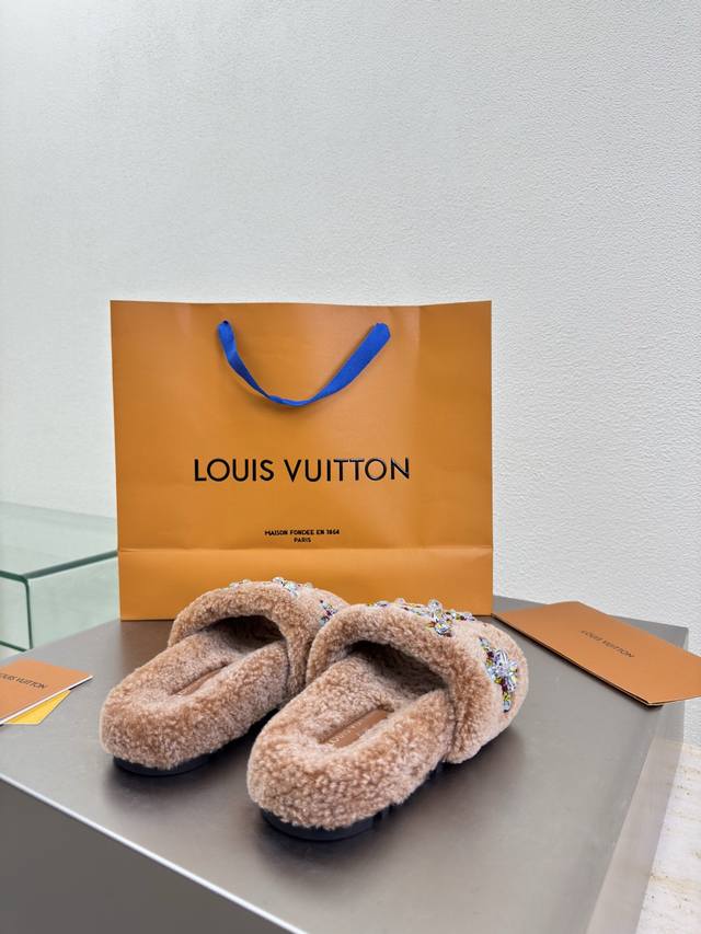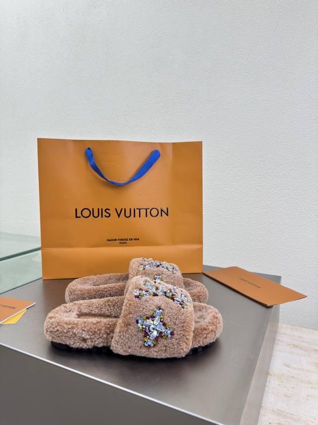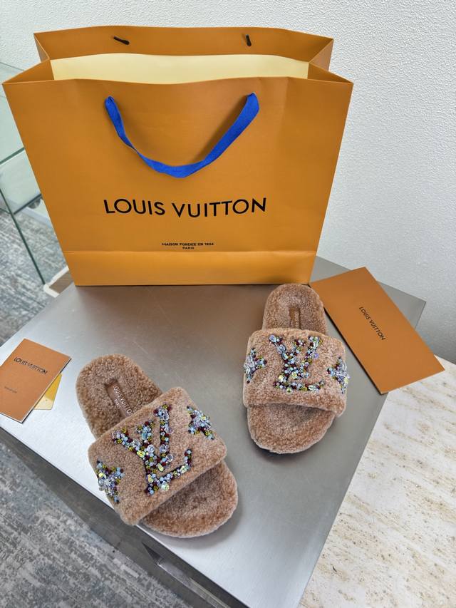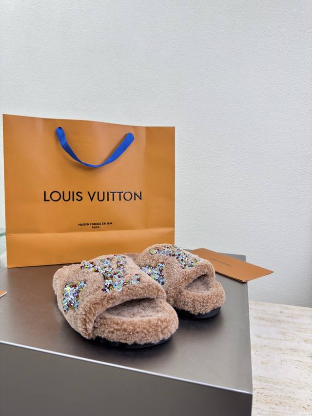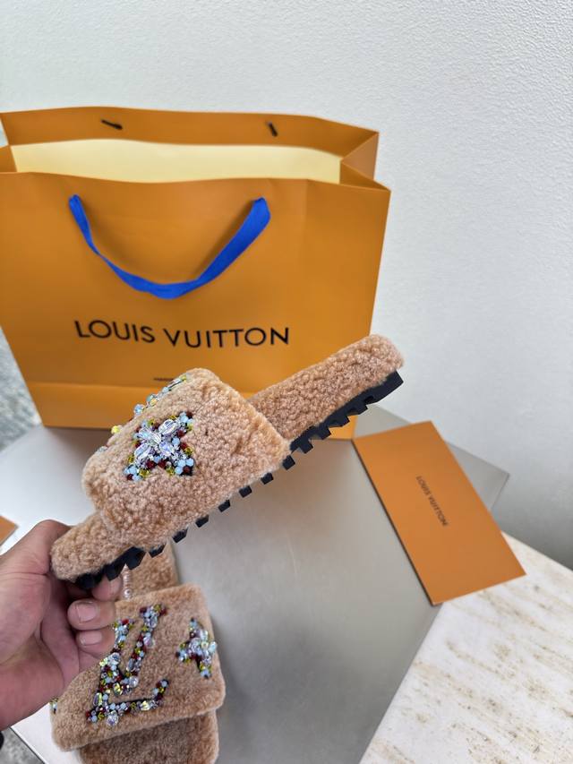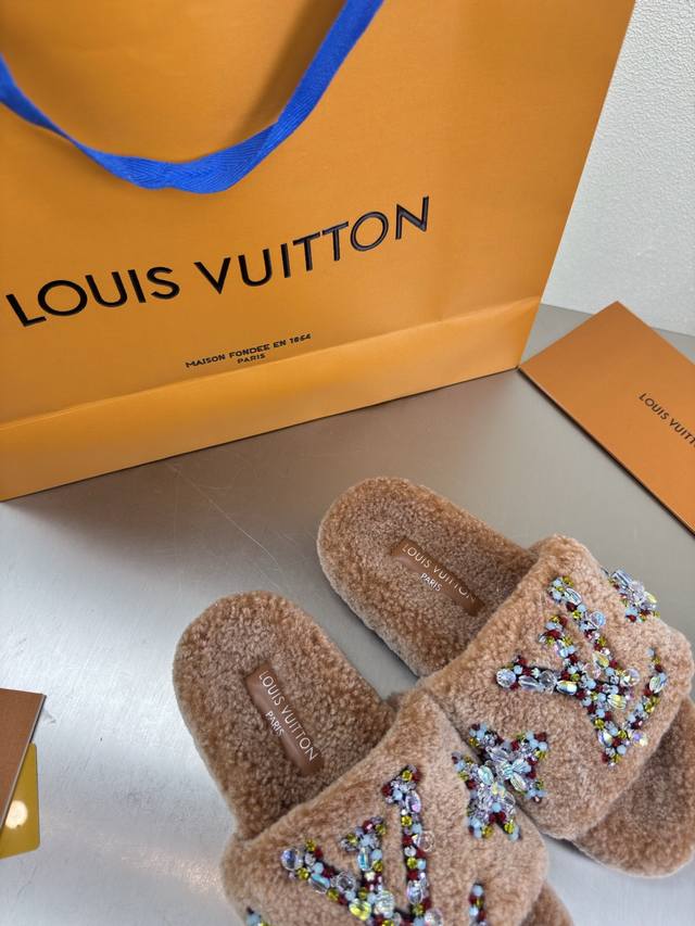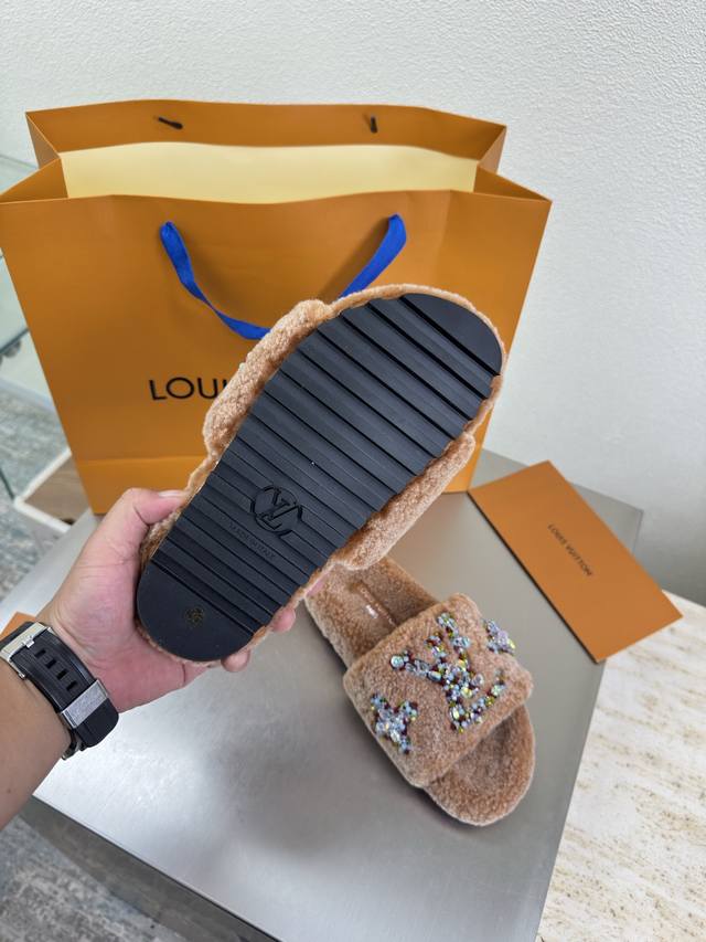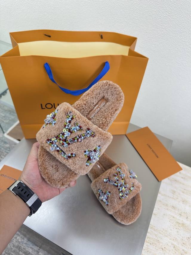 / 彩色钻石Logo 手工缝制 双色羊羔毛拖鞋 进口羊羔毛拖鞋 L驴超高性价比 包装 高品质 无瑕疵 5种配色 驼色羊羔毛 钻石手工缝制 Logo Lv 打造 使得