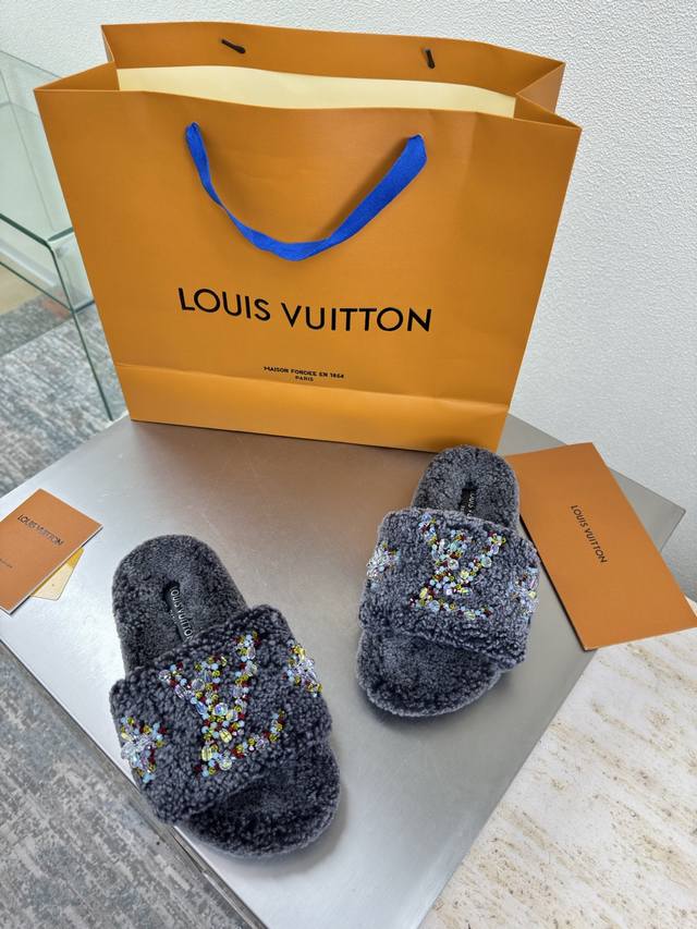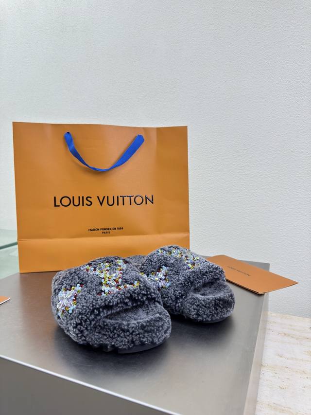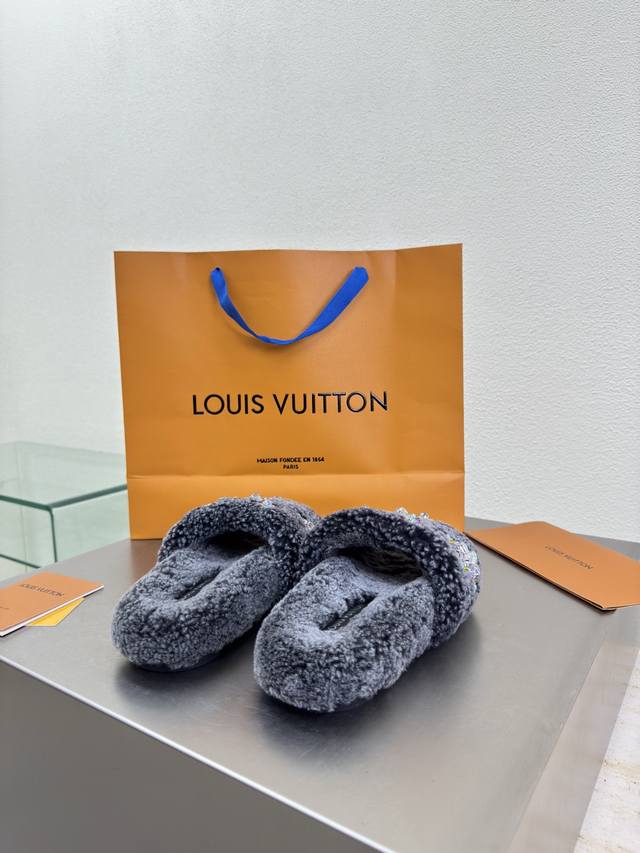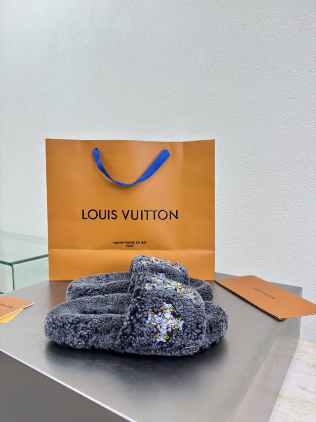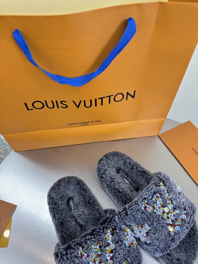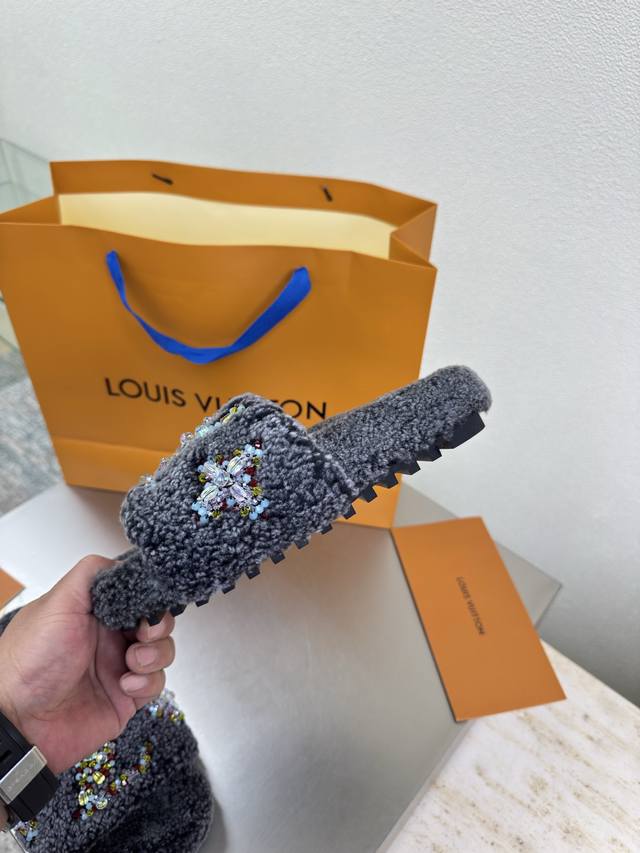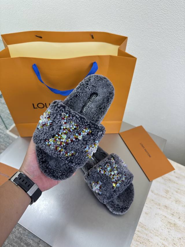 / 彩色钻石Logo 手工缝制 双色羊羔毛拖鞋 进口羊羔毛拖鞋 L驴超高性价比 包装 高品质 无瑕疵 5种配色 黑色羊羔毛 钻石手工缝制 Logo Lv 打造 使得