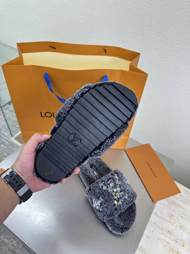 彩色钻石Logo 手工缝制 双色羊羔毛拖鞋 进口羊羔毛拖鞋 L驴超高性价比 包装 高品质 无瑕疵 5种配色 黑色羊羔毛 钻石手工缝制 Logo Lv 打造 使得