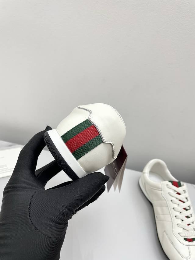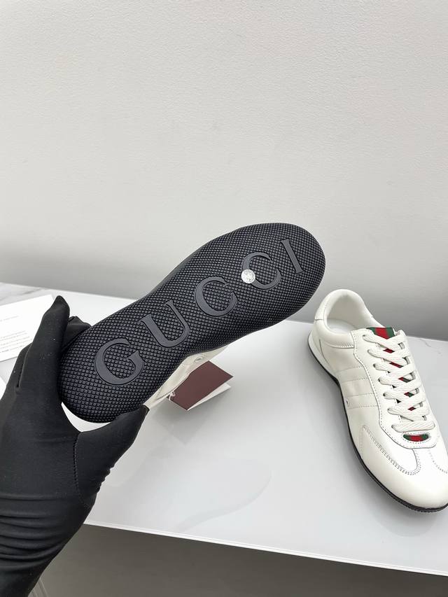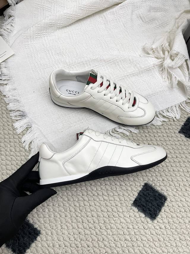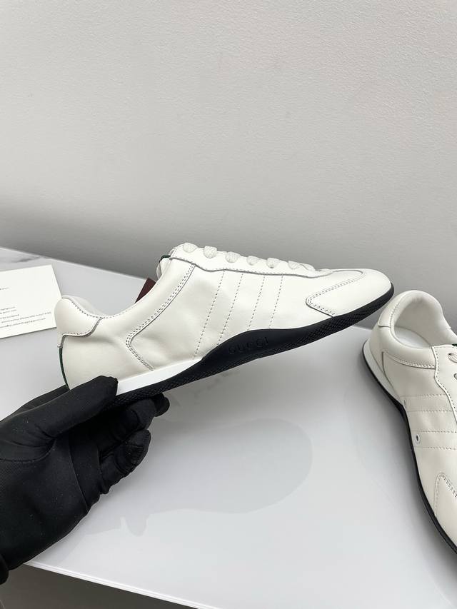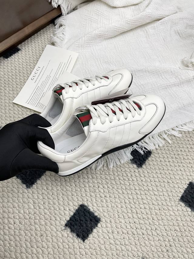 情侣款 带飞机盒 Gucci古驰Shift系列 情侣款 复古 德训鞋 休闲 运动鞋 原版购入开发 做货 Gucci Shift系列全新上市,轻盈设计焕新诠释运动风尚。利落廓形更添自在本色,行动间彰显精致质感。织带细节宛如一道延绵不绝的饰带贯穿于整个设计,侧边缝线细节增添点睛之笔 面料: 原版定制进口头层牛皮 内里: 原版定制柔软羊皮里 大底: 原版开模防滑Tpu材质 底厚: 2Cm Size: 女款35-40 男款39-45 女40 男45定做