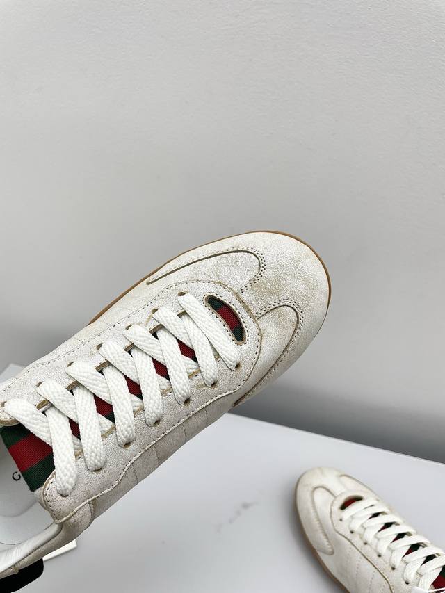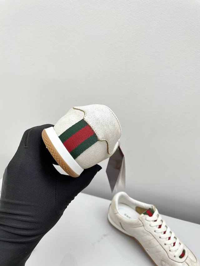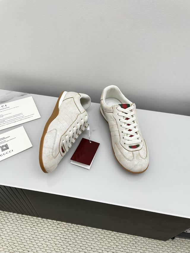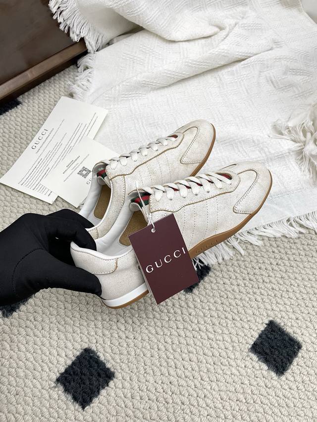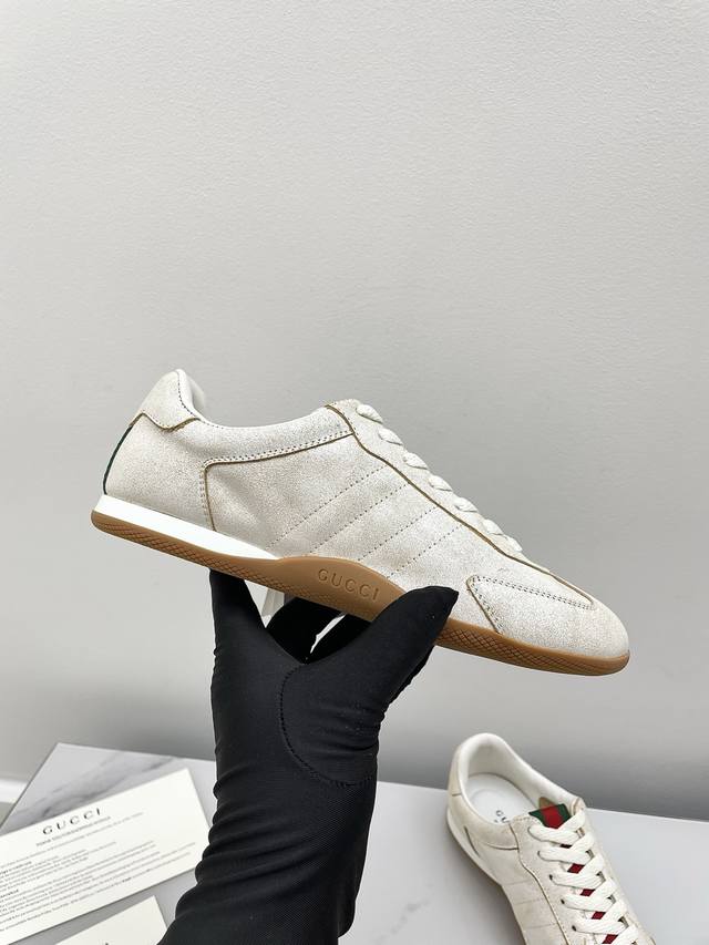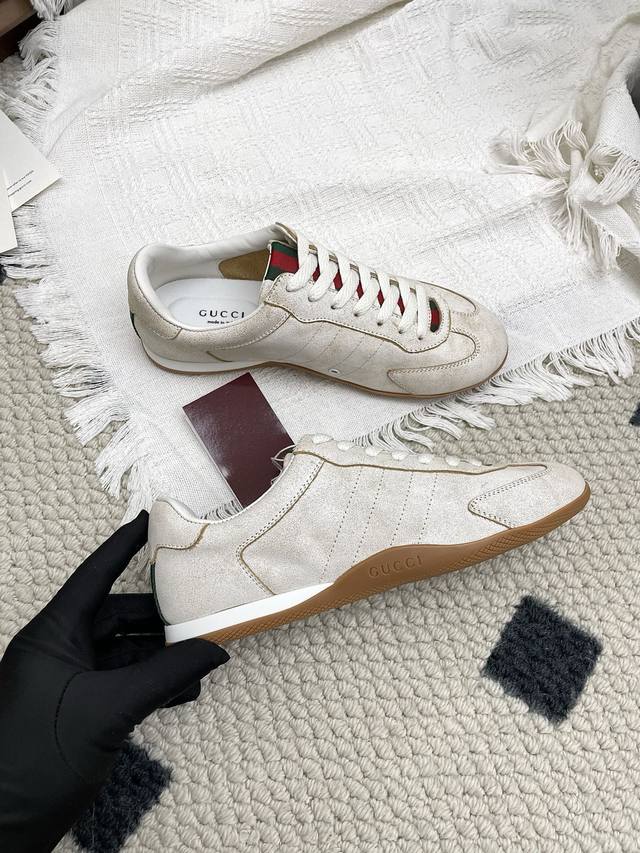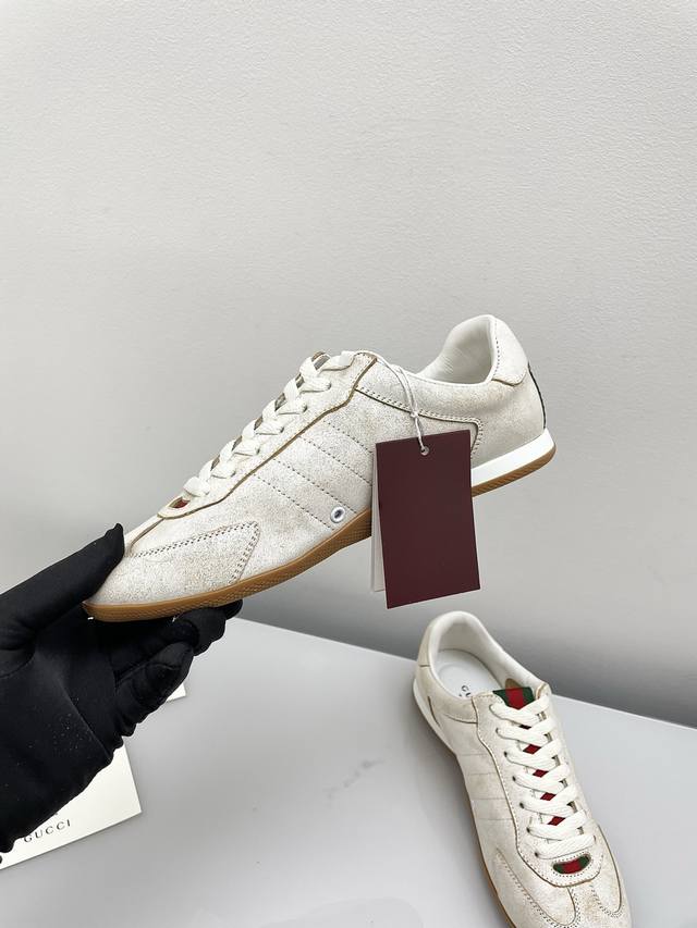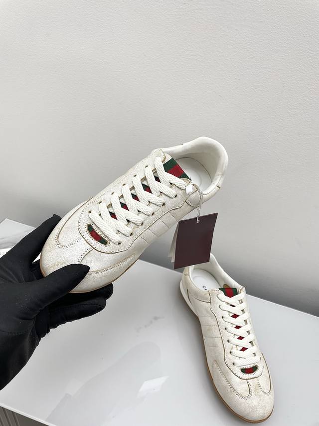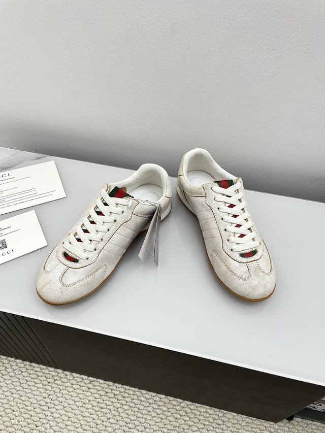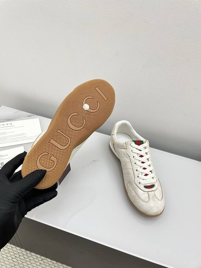 情侣款 带飞机盒 Gucci古驰Shift系列 情侣款 复古 德训鞋 休闲 运动鞋 原版购入开发 做货 Gucci Shift系列全新上市,轻盈设计焕新诠释运动风尚。利落廓形更添自在本色,行动间彰显精致质感。织带细节宛如一道延绵不绝的饰带贯穿于整个设计,侧边缝线细节增添点睛之笔 面料: 原版定制进口头层牛皮 内里: 原版定制柔软羊皮里 大底: 原版开模防滑Tpu材质 底厚: 2Cm Size: 女款35-40 男款39-45 女40 男45定做