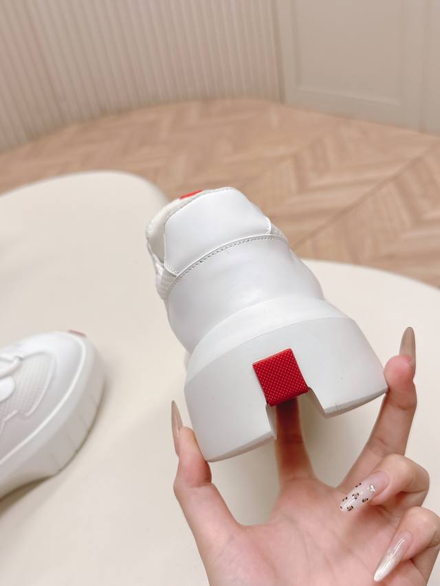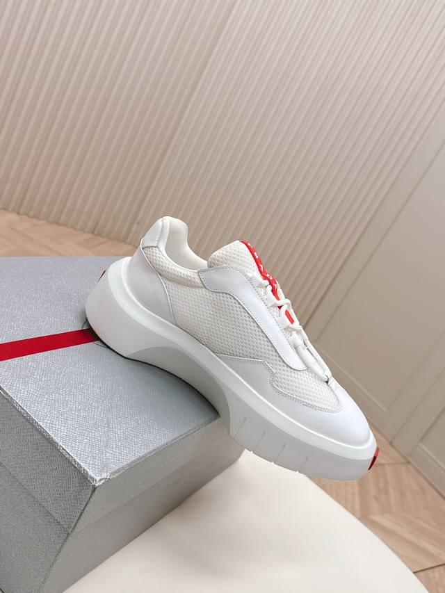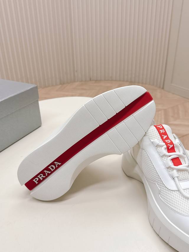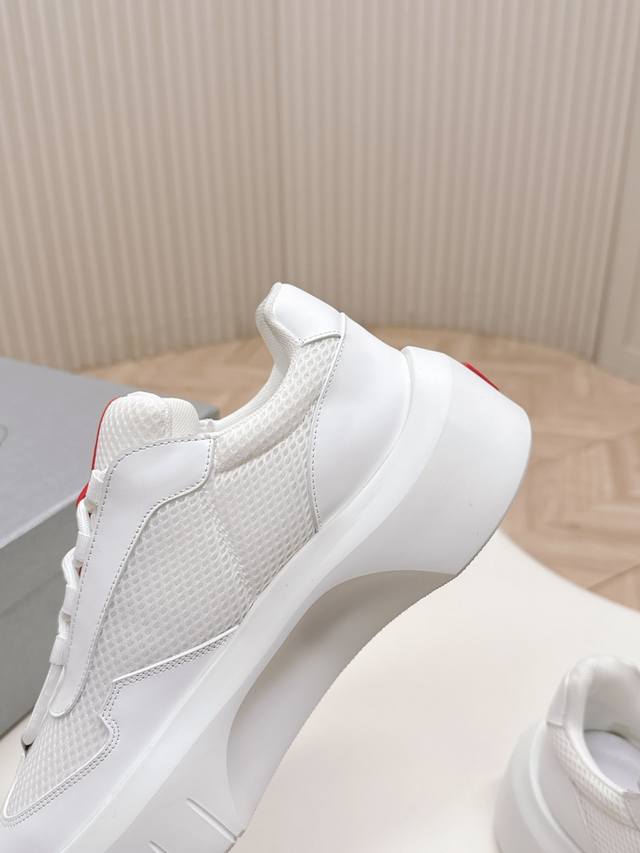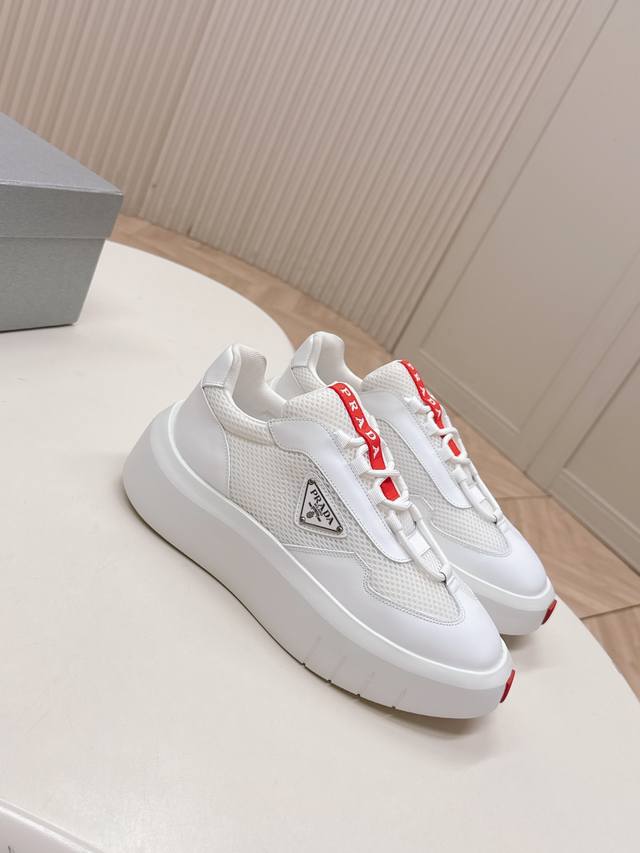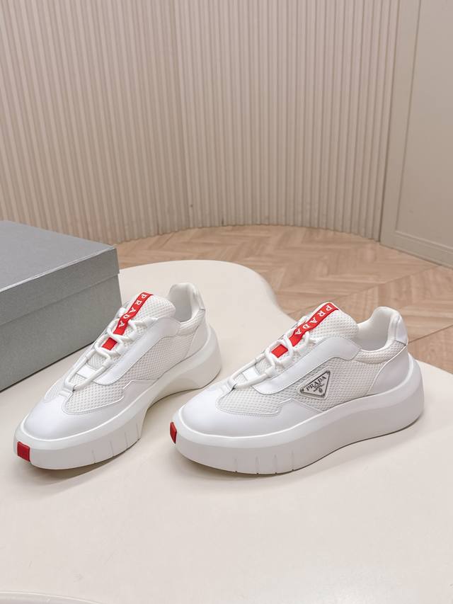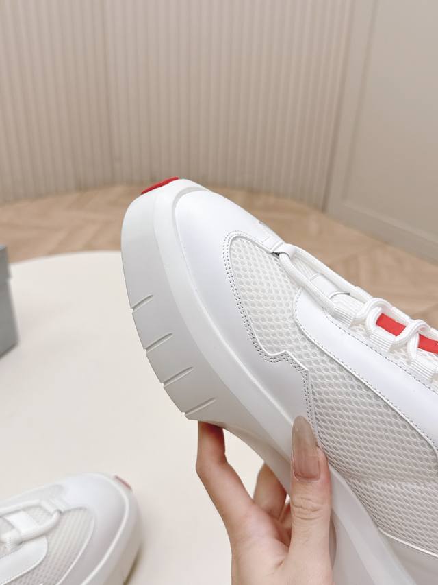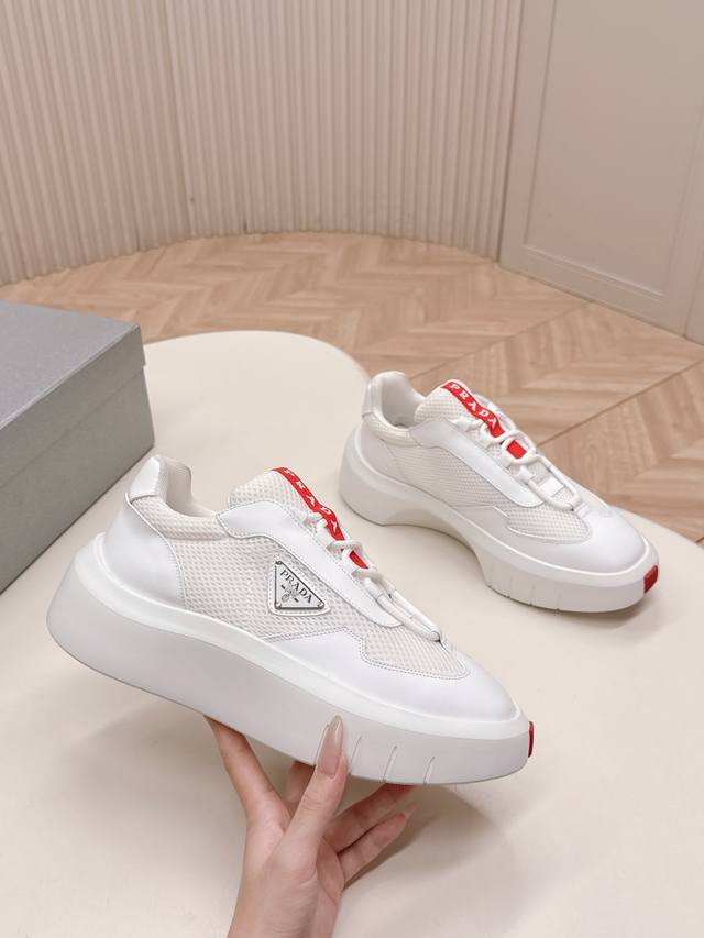 / 情侣款 Prada普拉达 小白鞋休闲运动鞋系列 经典升级 这款运动鞋延续经久不衰的轮廓 。采用牛皮革精心制作, 提升格调。款式轻盈,搭配三角扣标志 四季皆宜,可