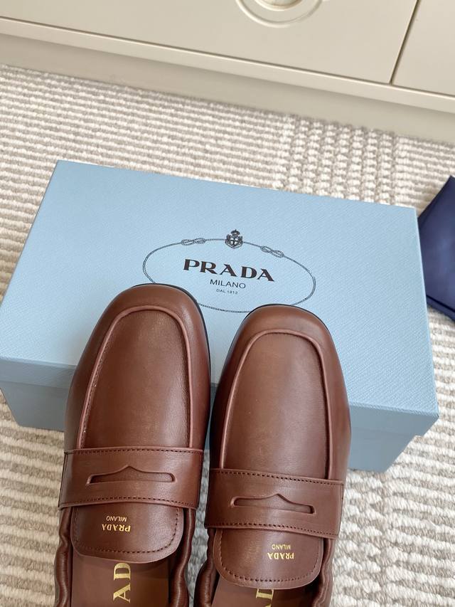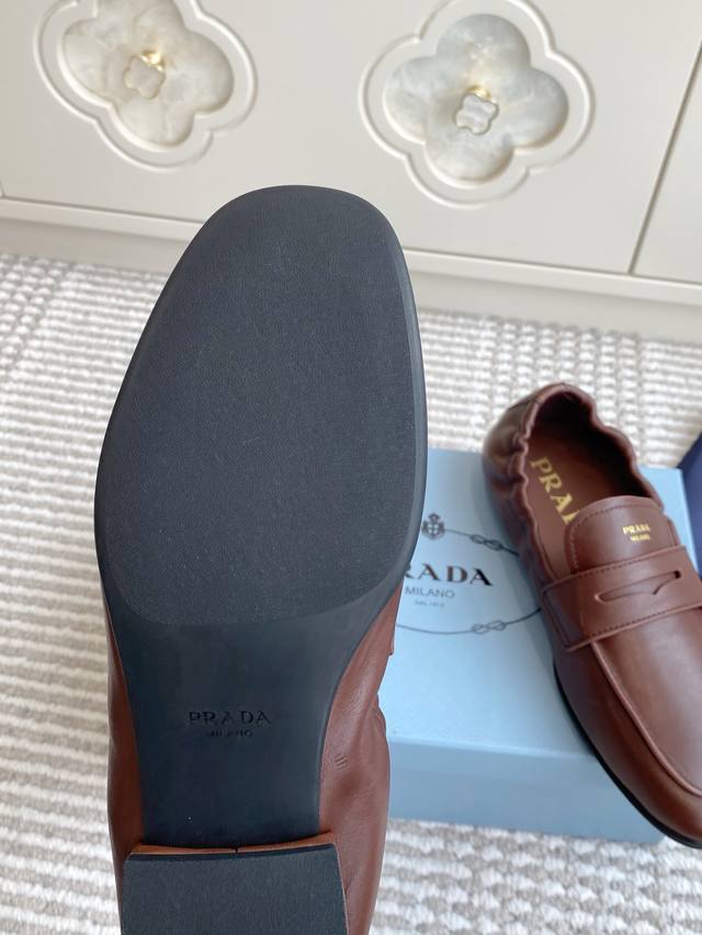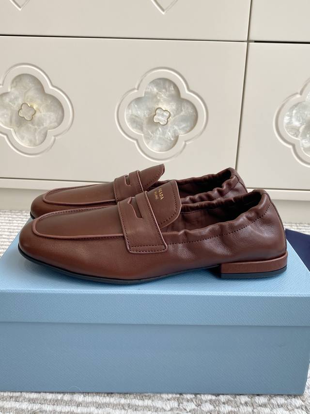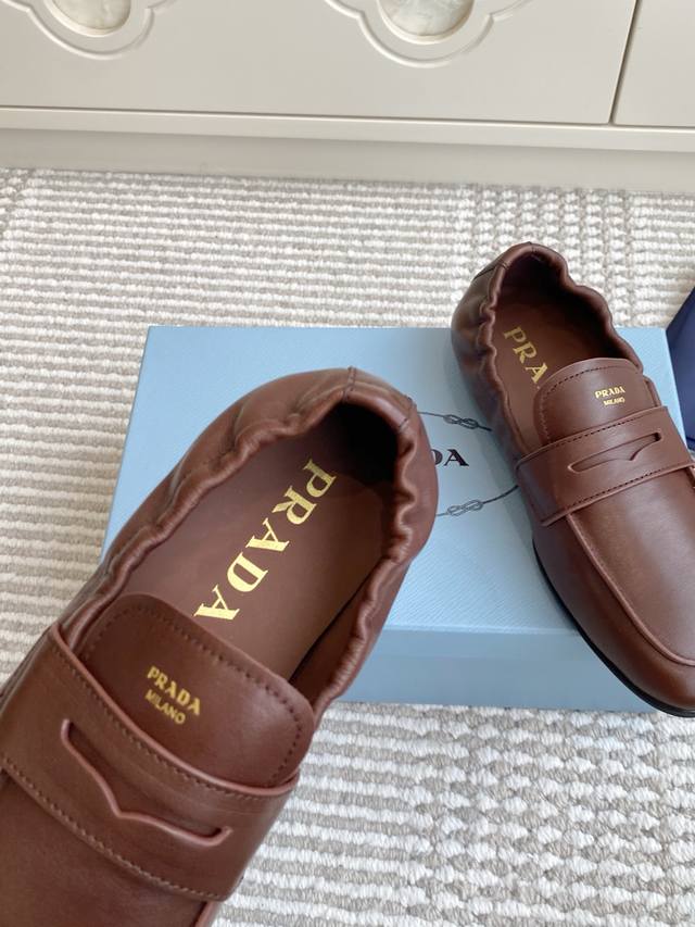 批女 男 Prada普拉达新品情侣方头乐福鞋 顶级品质 这款Nappa皮革乐福鞋彰显优雅复古气质,造就轻盈百搭造型。金色压花徽标细节点亮鞋履整体设计,适合搭配休闲造型。 鞋面:小牛皮 羊京 羊皮内里 原版开模大底 码数:35-45