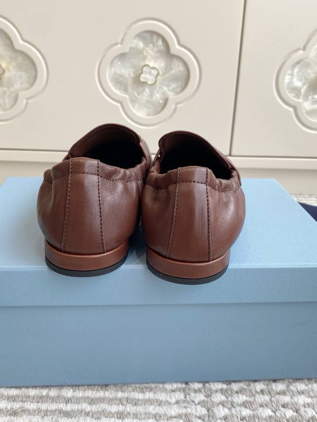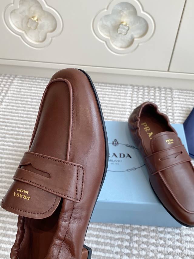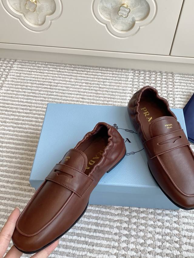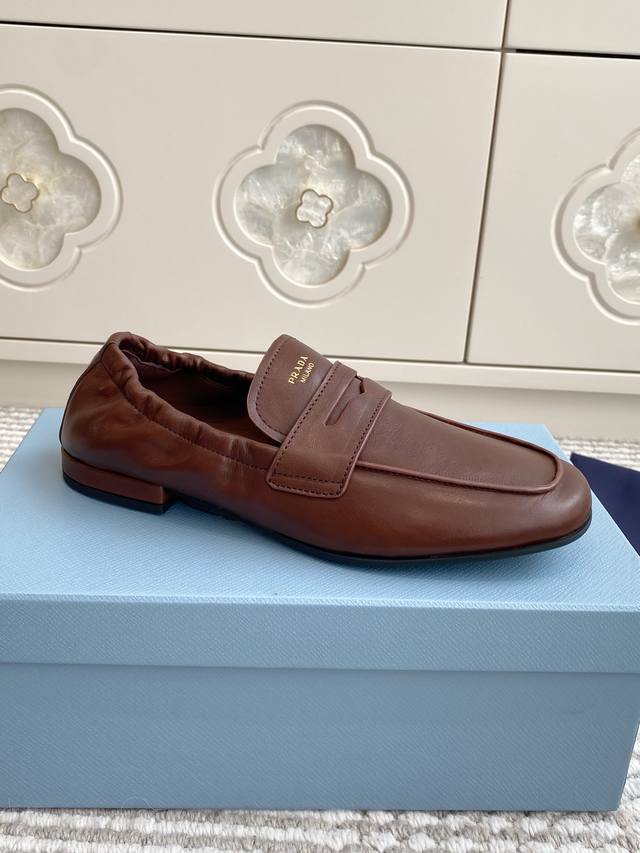 / 批女 男 Prada普拉达新品情侣方头乐福鞋 顶级品质 这款Nappa皮革乐福鞋彰显优雅复古气质,造就轻盈百搭造型。金色压花徽标细节点亮鞋履整体设计,适合搭配休