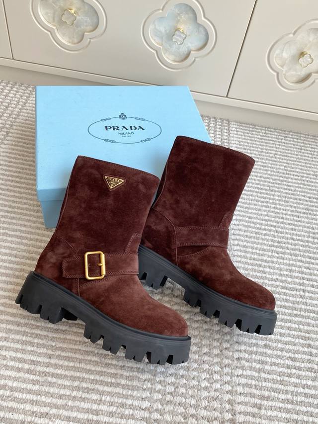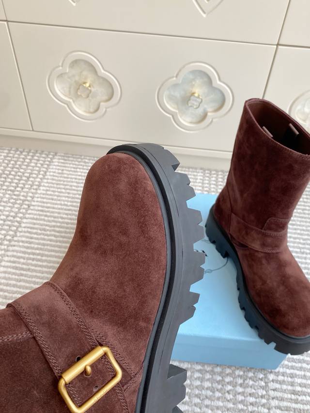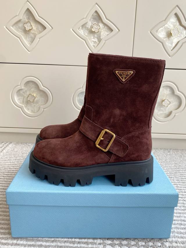 / 批羊京 牛皮 Prada普拉达新款厚底机车靴 短靴 顶级品质 精致线条与工艺构造定义此款皮革短靴,饰有标志性三角形徽标。独特的金属搭扣为机车风格增添个性,搭配厚