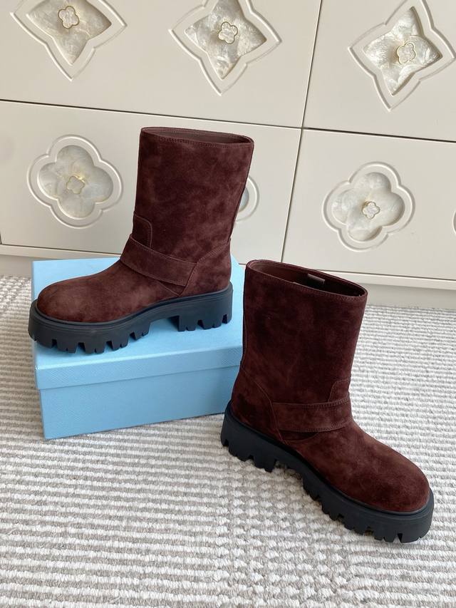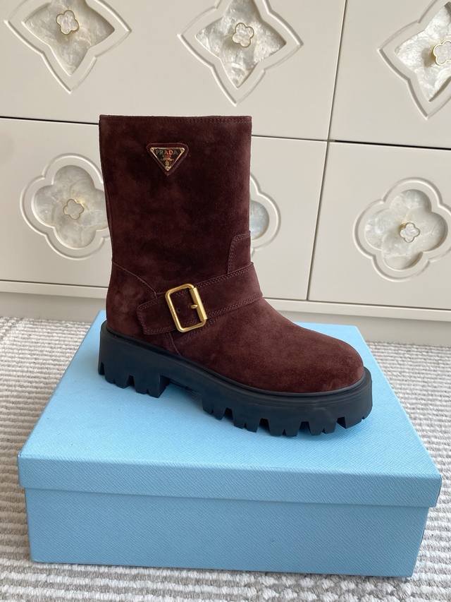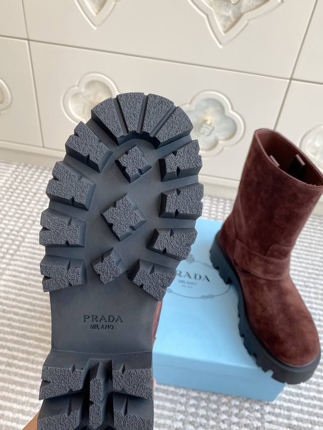 批羊京 牛皮 Prada普拉达新款厚底机车靴 短靴 顶级品质 精致线条与工艺构造定义此款皮革短靴,饰有标志性三角形徽标。独特的金属搭扣为机车风格增添个性,搭配厚实橡胶鞋底。 鞋面:进口牛皮 牛反绒 内里:羊皮 原版开模胎面花纹橡胶大底 Size:35-39 40.41定制不退换