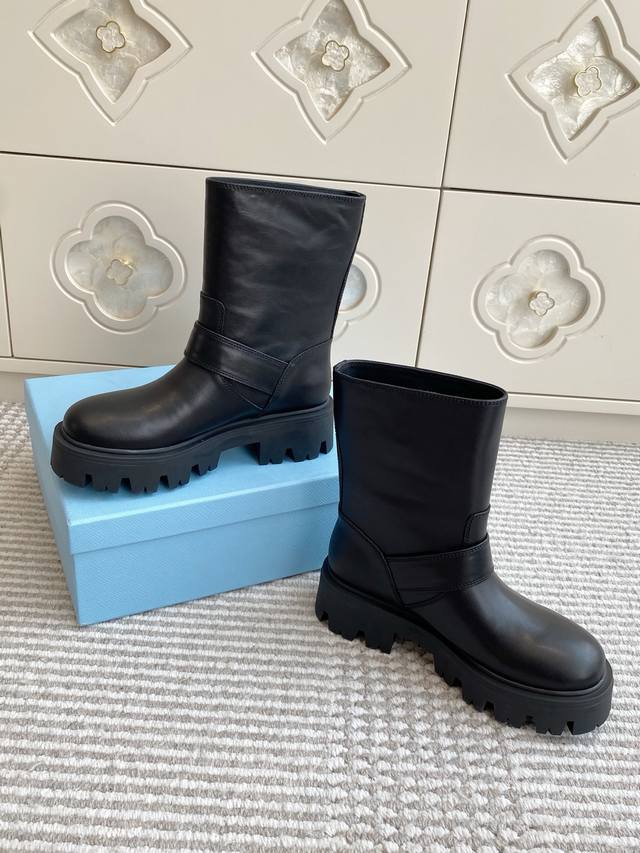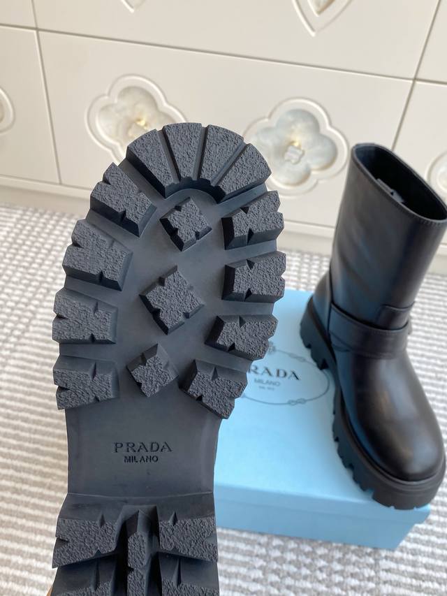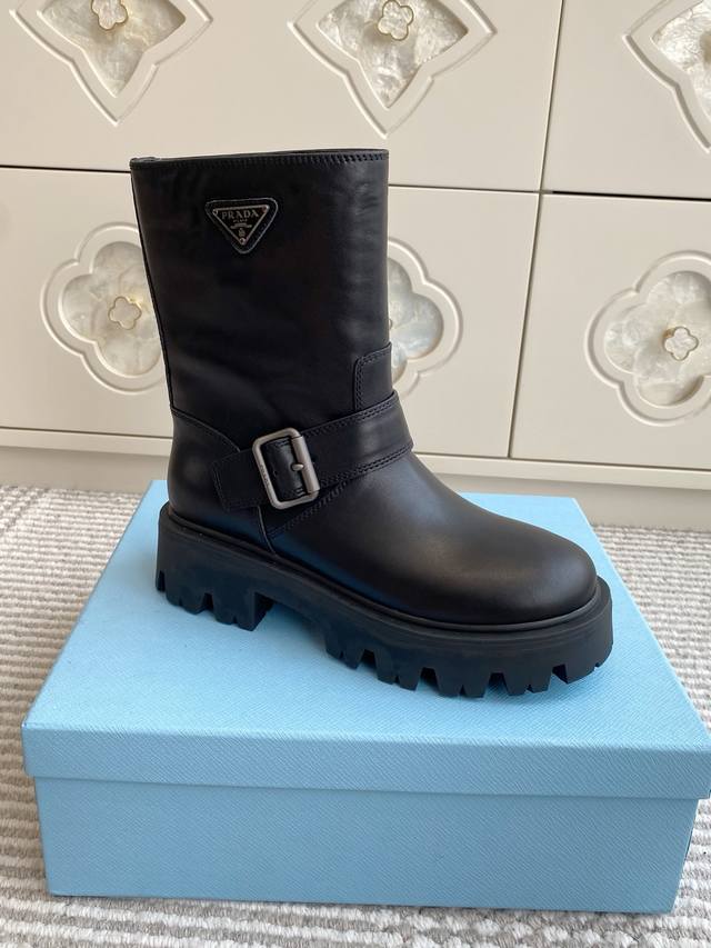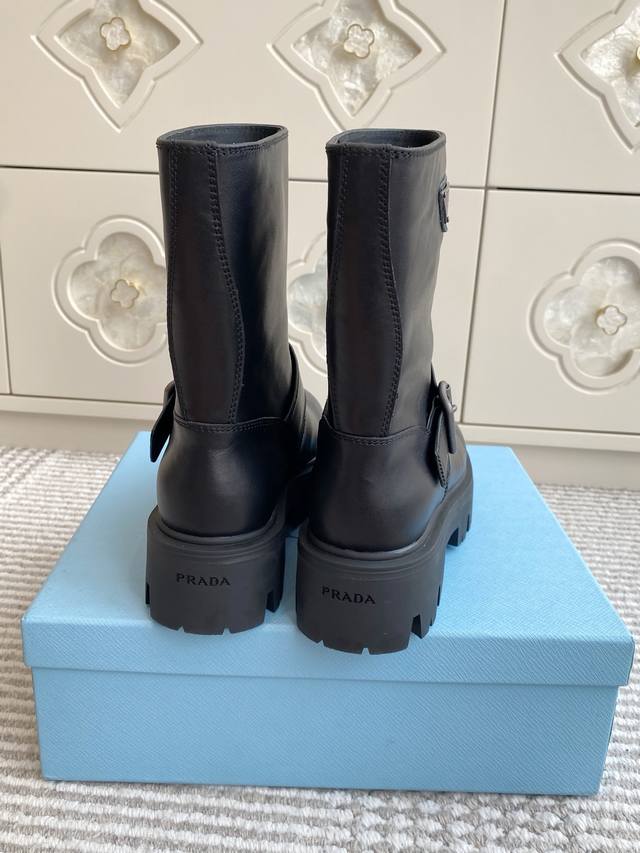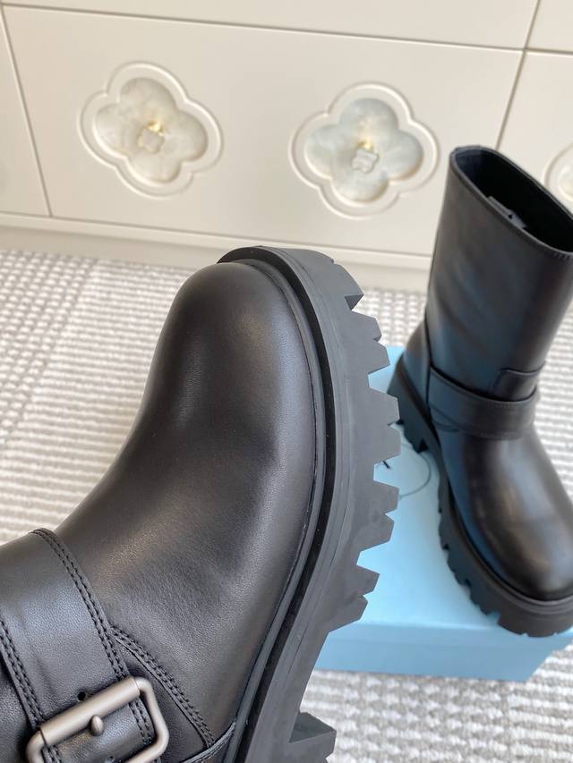 / 批羊京 牛皮 Prada普拉达新款厚底机车靴 短靴 顶级品质 精致线条与工艺构造定义此款皮革短靴,饰有标志性三角形徽标。独特的金属搭扣为机车风格增添个性,搭配厚