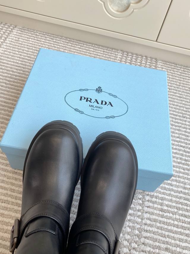 批羊京 牛皮 Prada普拉达新款厚底机车靴 短靴 顶级品质 精致线条与工艺构造定义此款皮革短靴,饰有标志性三角形徽标。独特的金属搭扣为机车风格增添个性,搭配厚实橡胶鞋底。 鞋面:进口牛皮 牛反绒 内里:羊皮 原版开模胎面花纹橡胶大底 Size:35-39 40.41定制不退换