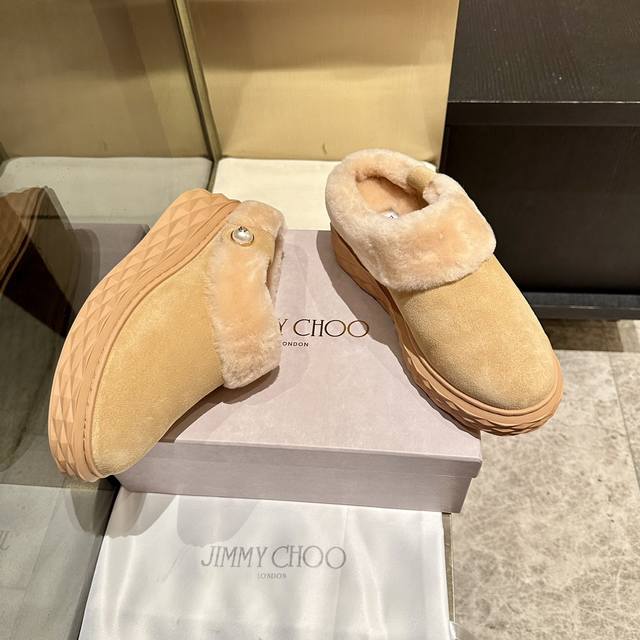 新款吉米周 Jimmy Choo ,独家发售,拖鞋羊毛里,采用最新工艺设计,立体感强多种工艺融合一起,颠覆时尚,超级有型!搭配超美。原版一比一,真羊毛保暖雪地靴