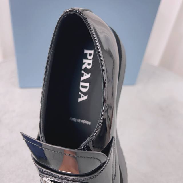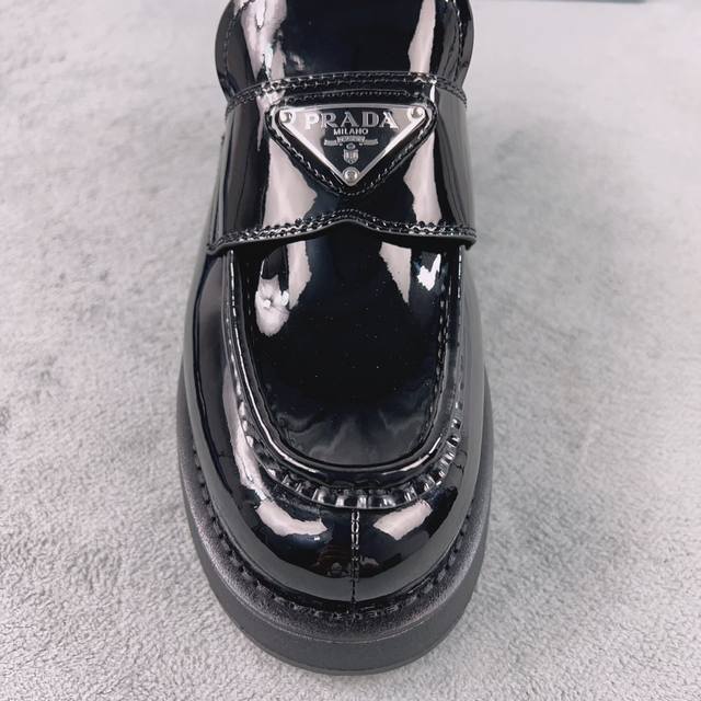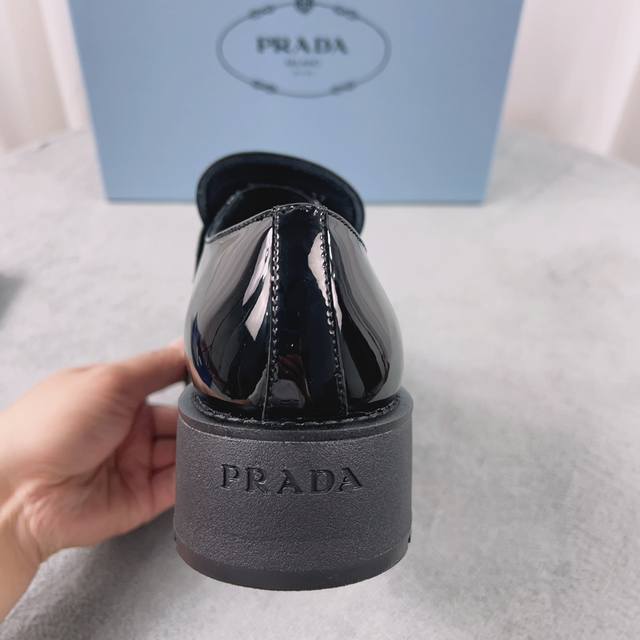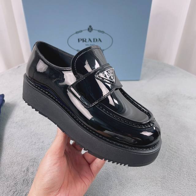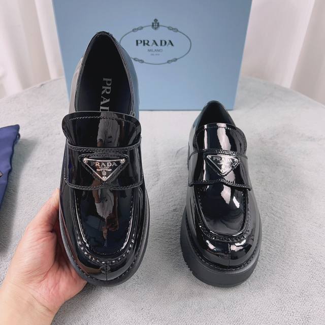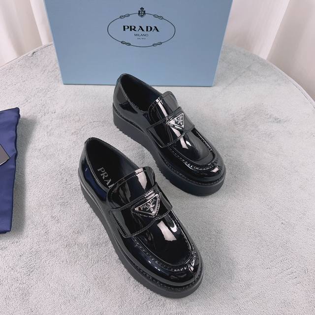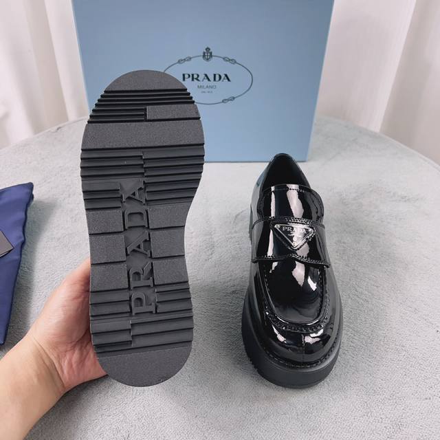 普拉达新款乐福鞋 面:进口开边珠 漆皮 里:混种羊皮 底:松糕组合厚底 跟高:4Cm Size:35-41