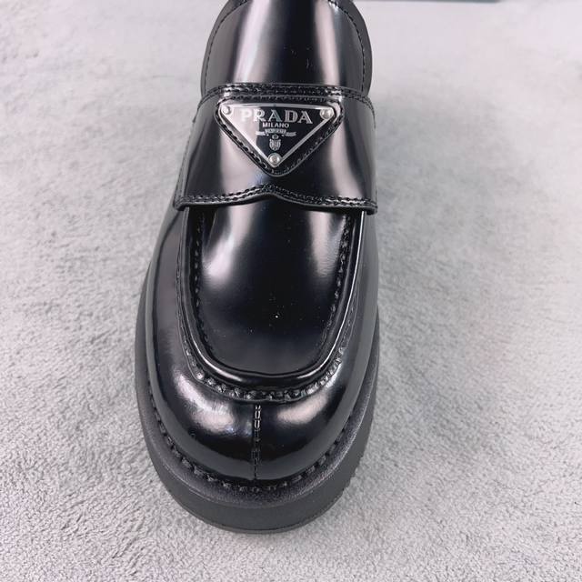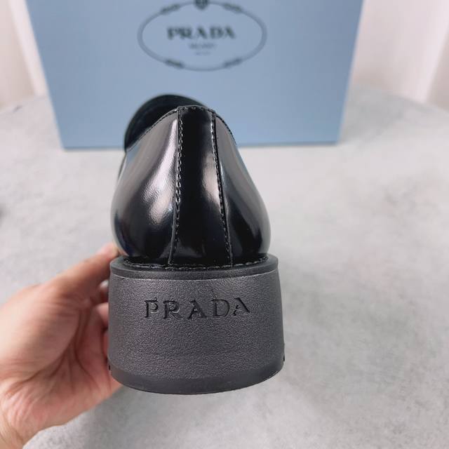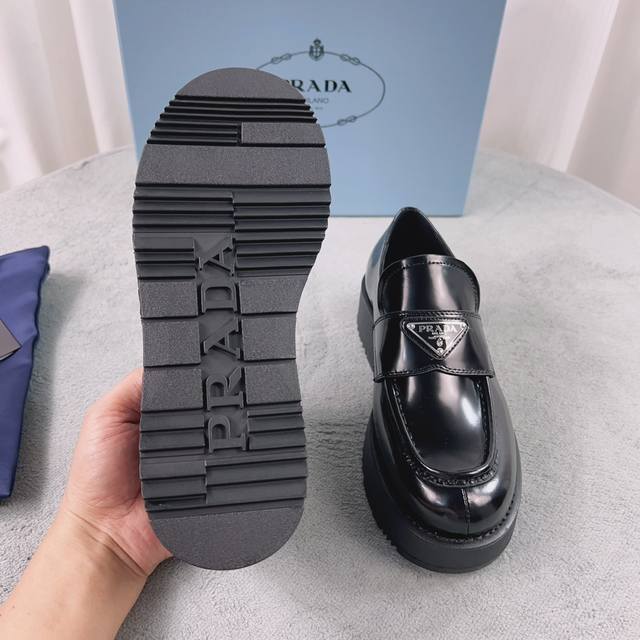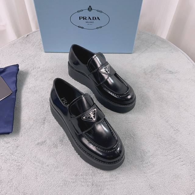 普拉达新款乐福鞋 面:进口开边珠 漆皮 里:混种羊皮 底:松糕组合厚底 跟高:4Cm Size:35-41