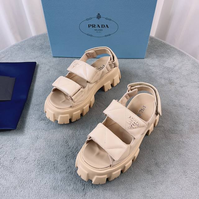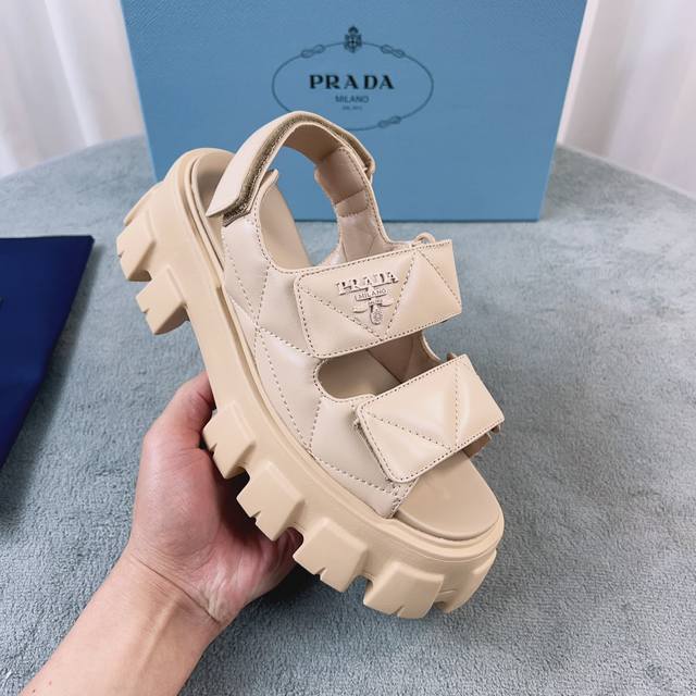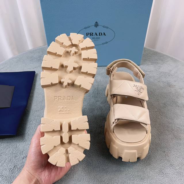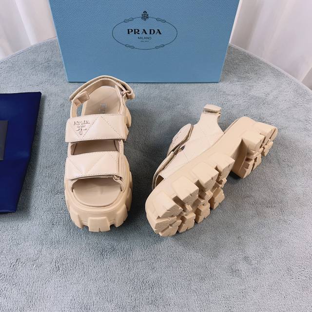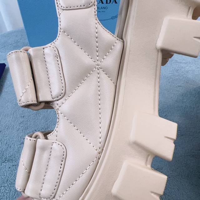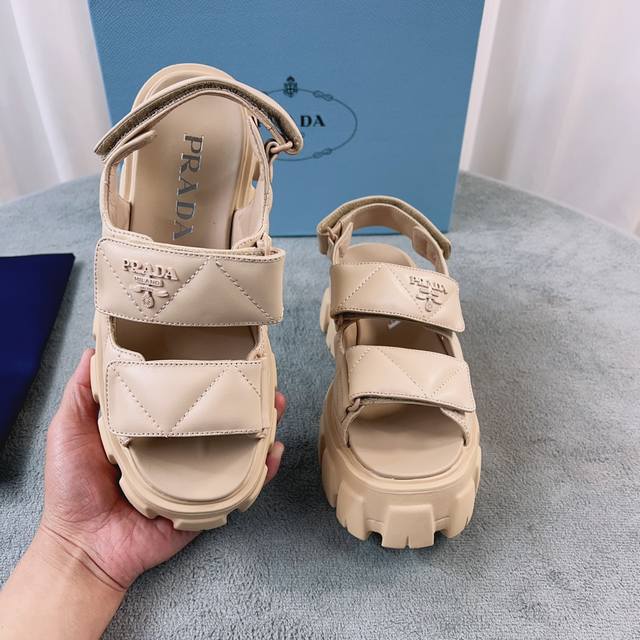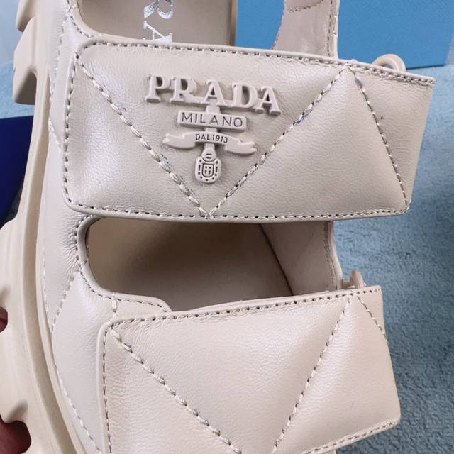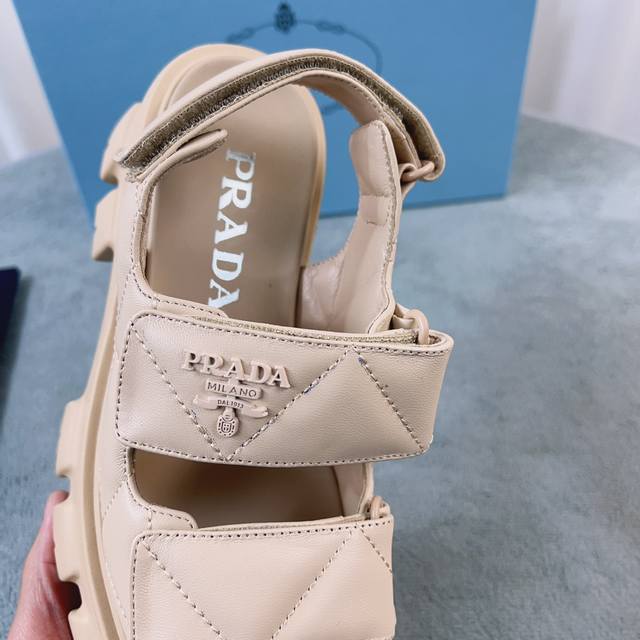 普拉达新款凉鞋 面:进口羊皮 里:进口混种羊皮 底:松糕带Logo防滑厚底 后跟高6Cm 码数:35-41