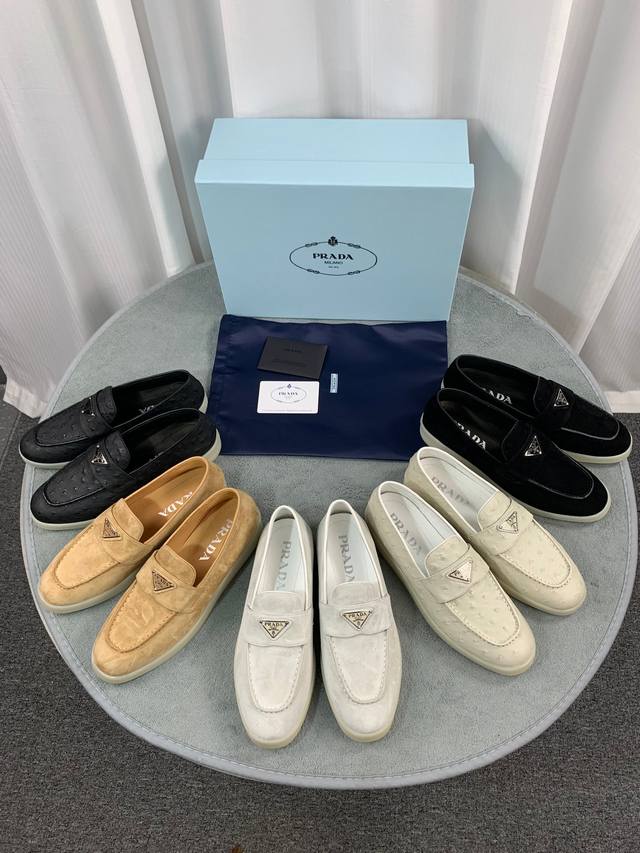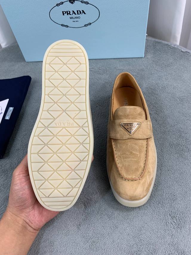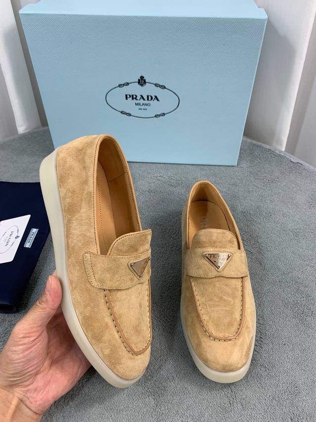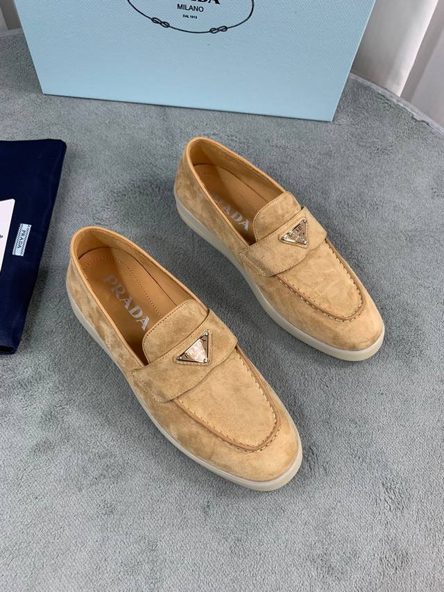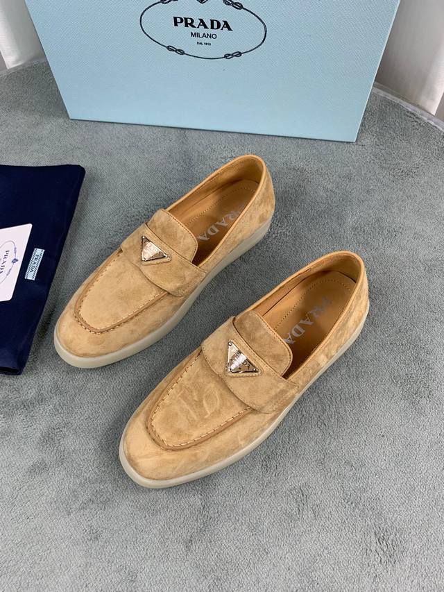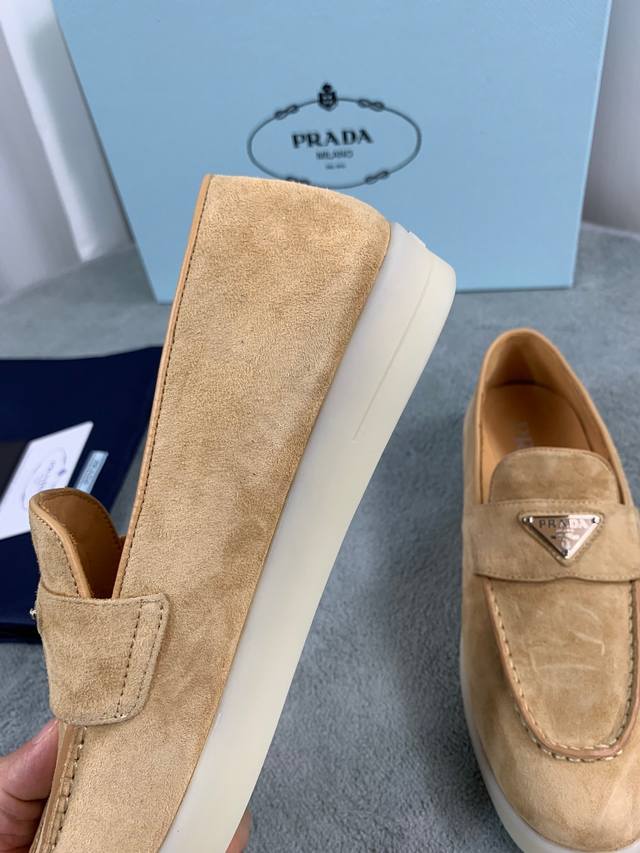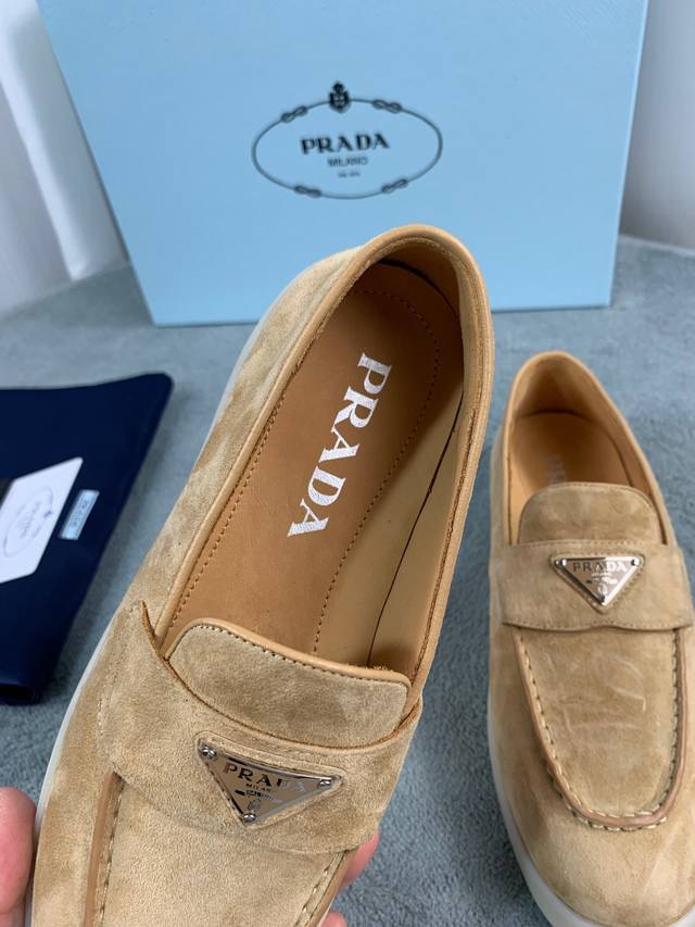 普拉达春夏新款乐福鞋 金属三角形徽标 面:进口牛皮和牛反绒 里:超软牛皮里、垫脚 底:原版轻盈防滑Tpu耐磨大底 Size:35-40 41定做