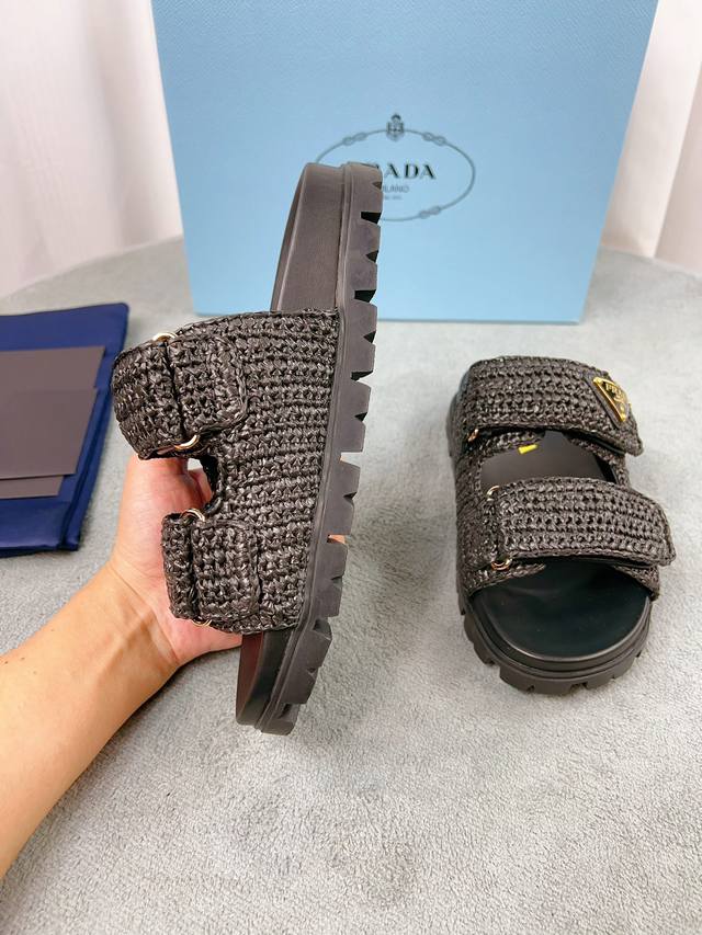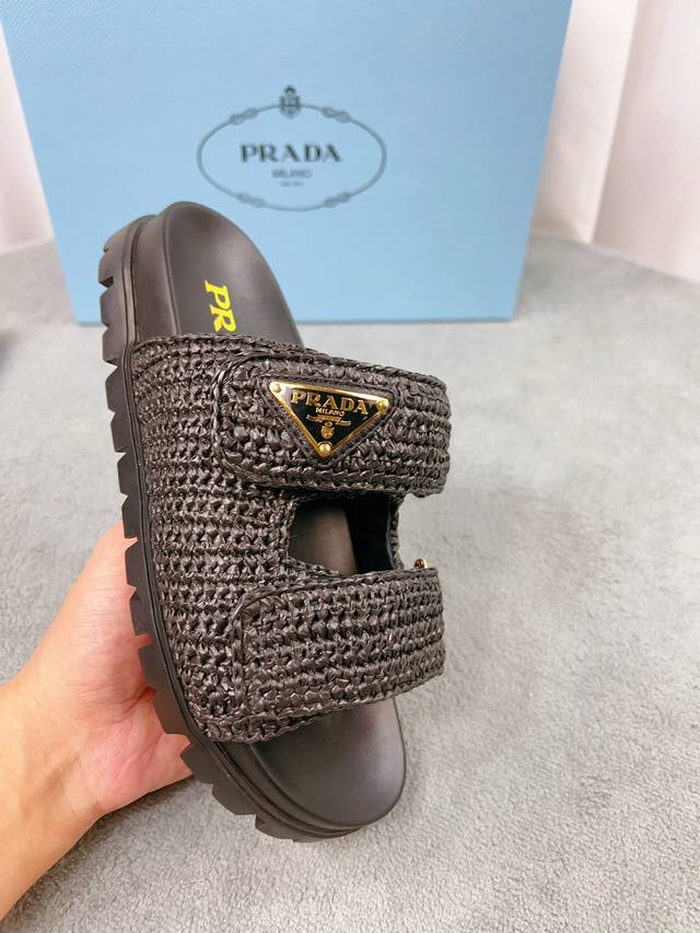 普拉达最新款 面:原版定制拉菲草 里:进口混种羊皮 底:原版1:1开模大底 跟高:2.5Cm Size:35-41