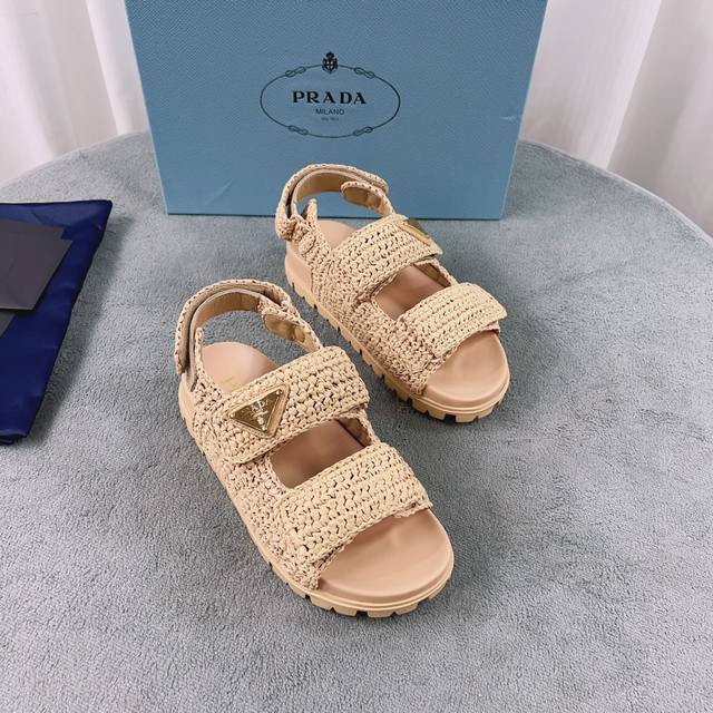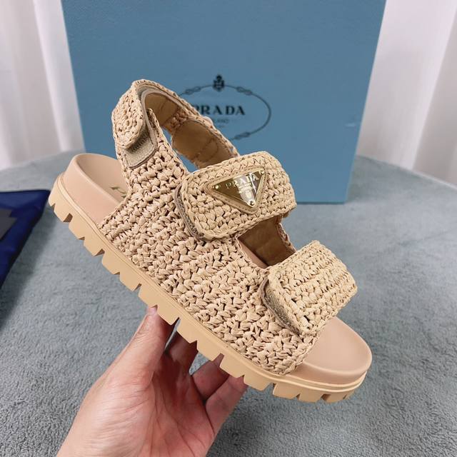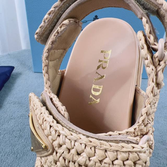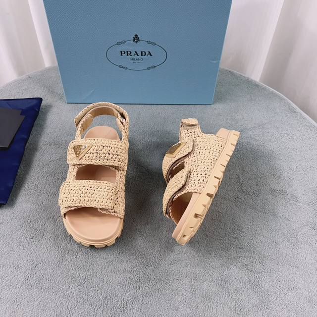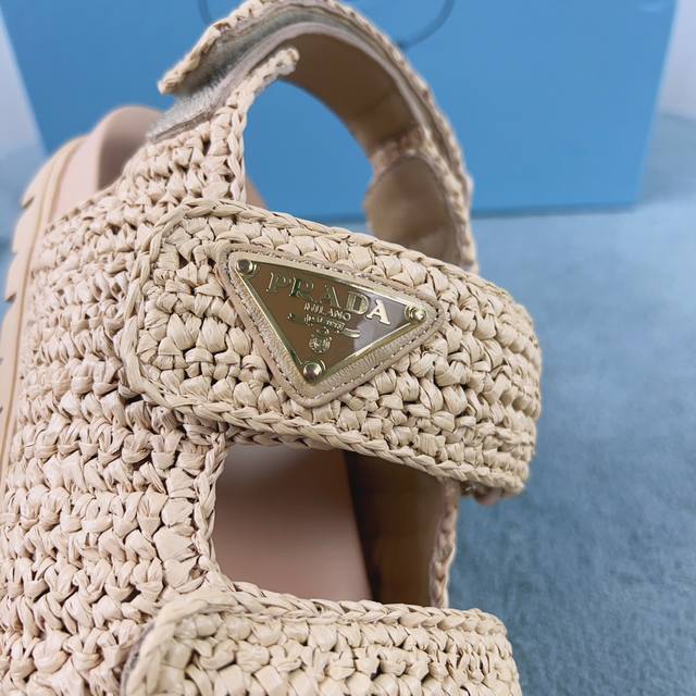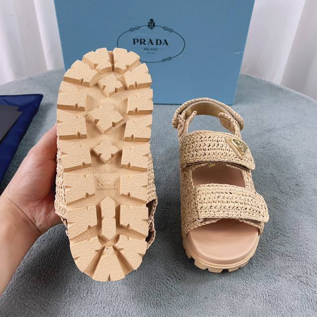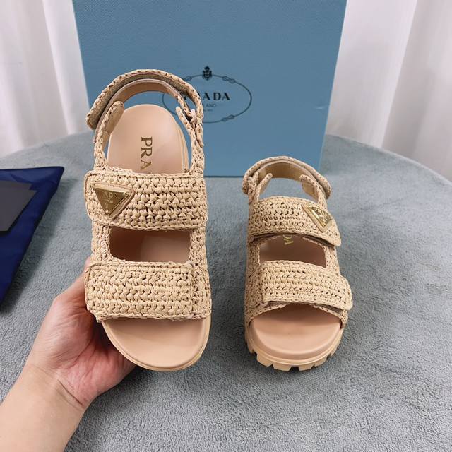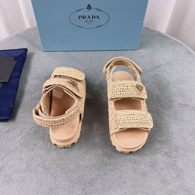 普拉达最新款 面:原版定制拉菲草 里:进口混种羊皮 底:原版1:1开模大底 跟高:2.5Cm Size:35-41
