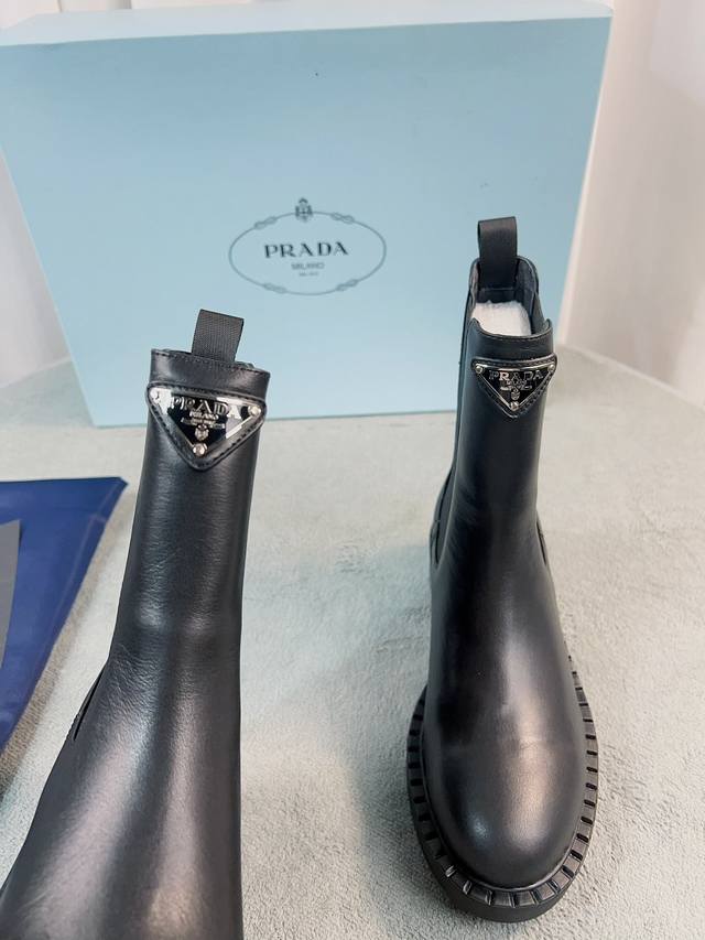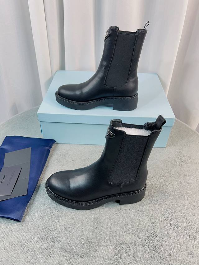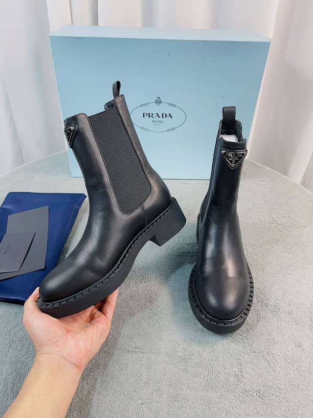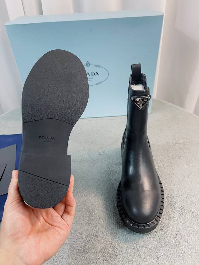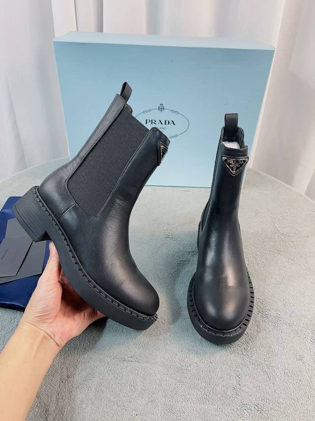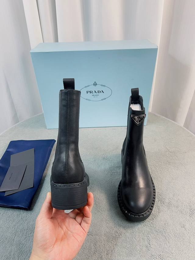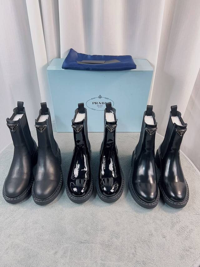 普拉达最新短靴系列 面:进口小牛皮、牛漆皮、开边珠牛皮 里:进口混种羊皮 底:意大利原版1:1大底 码数:35 41