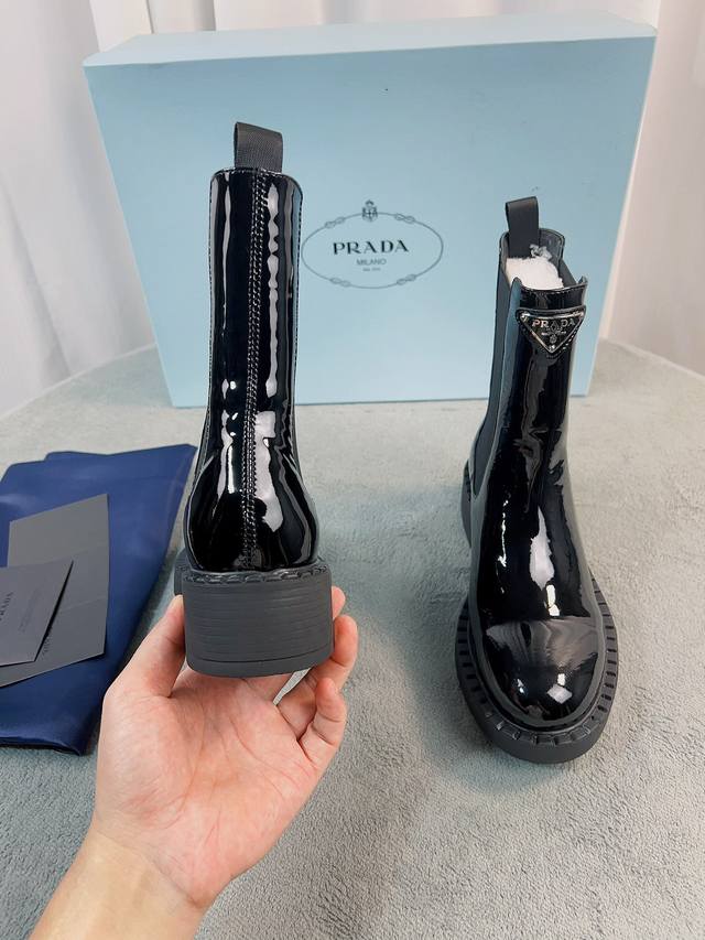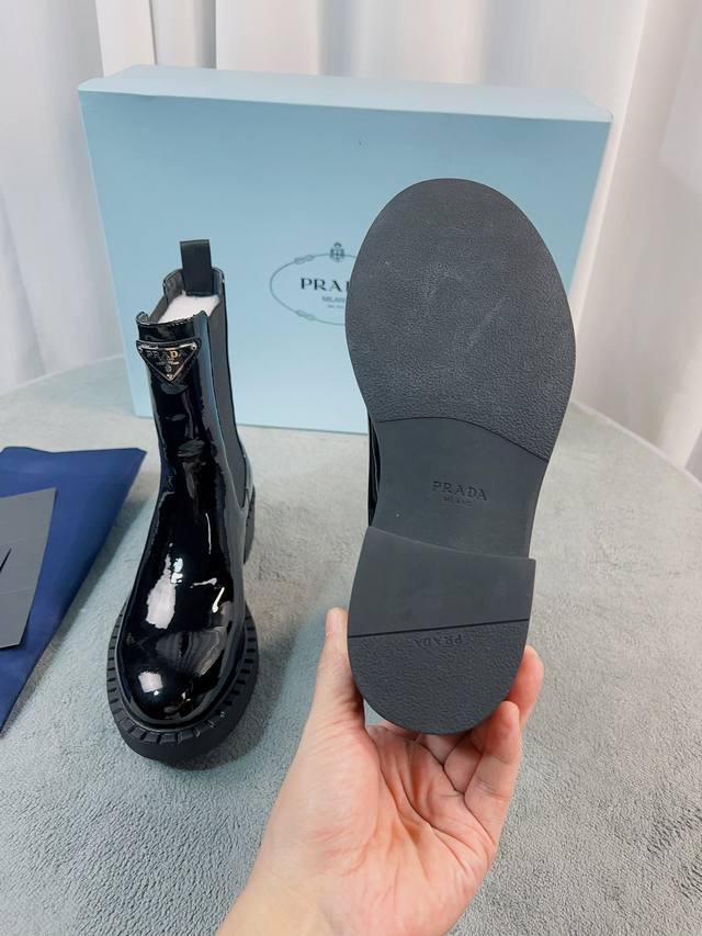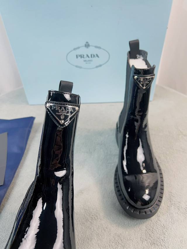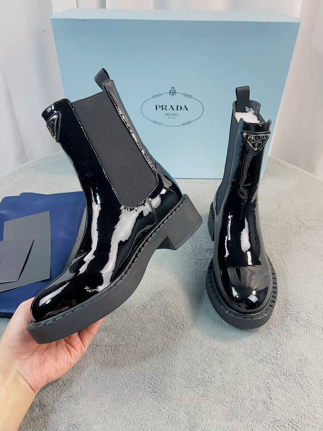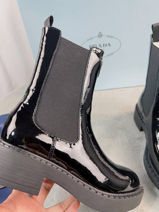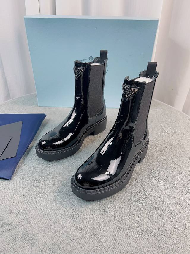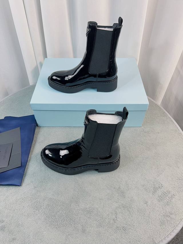 普拉达最新短靴系列 面:进口小牛皮、牛漆皮、开边珠牛皮 里:进口混种羊皮 底:意大利原版1:1大底 码数:35 41