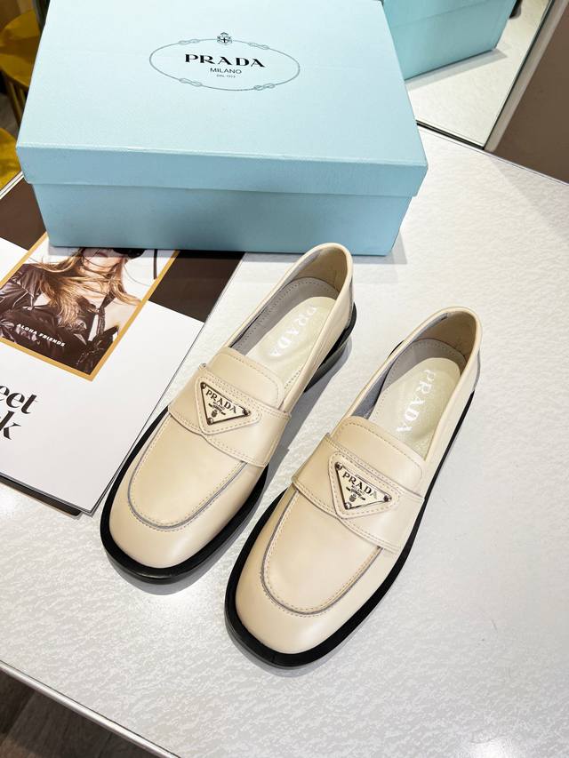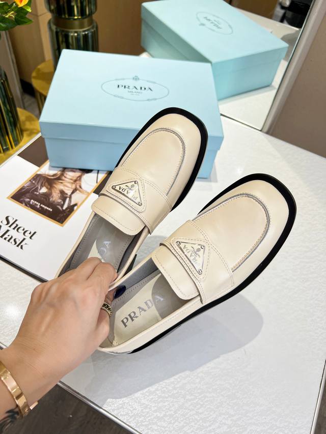 普拉达 新款开边朱厚底休闲小皮鞋,刘雯众多网红上脚,Prad这款松糕厚底鞋今年非常爆,穿上 增高 休闲两不失误,清爽的表现足以表达对鞋子的个个细节的把控,原版五金扣 面料:进口开边朱 丝绸羊皮内里, 厚底松糕鞋,带Logo 防滑鞋底,这款鞋子上脚非常舒服,脚感很棒 跟高5.5Cm 码数:35-41配专柜包装出货