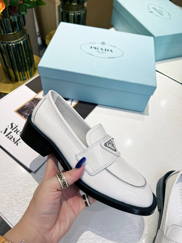 普拉达 新款开边朱厚底休闲小皮鞋,刘雯众多网红上脚,Prad这款松糕厚底鞋今年非常爆,穿上 增高 休闲两不失误,清爽的表现足以表达对鞋子的个个细节的把控,原版五金扣 面料:进口开边朱 丝绸羊皮内里, 厚底松糕鞋,带Logo 防滑鞋底,这款鞋子上脚非常舒服,脚感很棒 跟高5.5Cm 码数:35-41配专柜包装出货