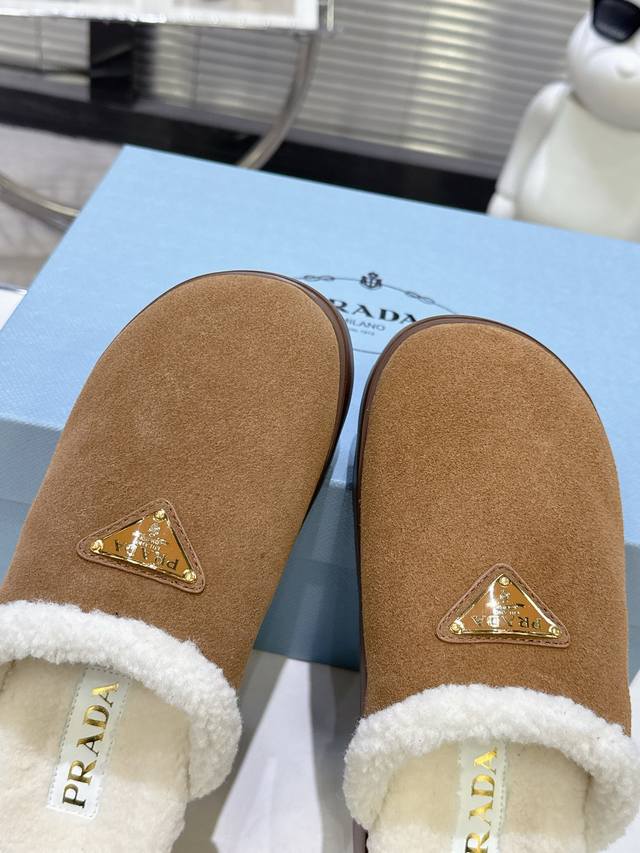 普拉达 Parda 爆款秋冬包头毛拖鞋 走秀单品,冬季室内,早春室外。该款羊皮毛拖鞋配有橡胶Ip超轻发泡鞋底,软羊革绗缝图案呼应标志性的Prada三角形,伴以涂