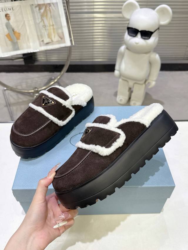 普拉达 Parda 秋冬爆款包头毛拖鞋 走秀单品,冬季室内,早春室外。该款羊皮毛拖鞋配有橡胶Ip超轻发泡鞋底,软羊革绗缝图案呼应标志性的Prada三角形,伴以涂