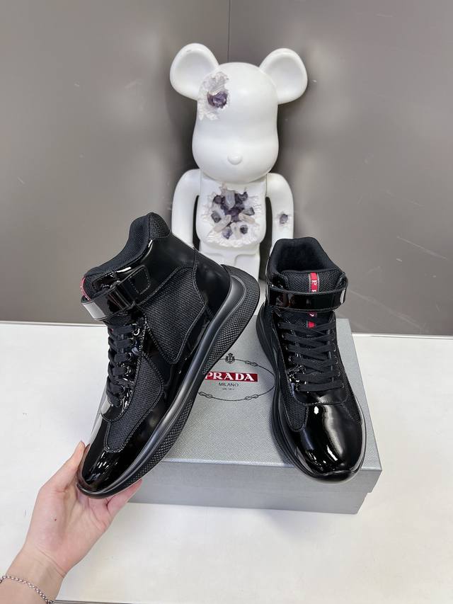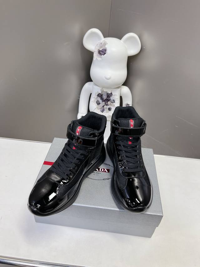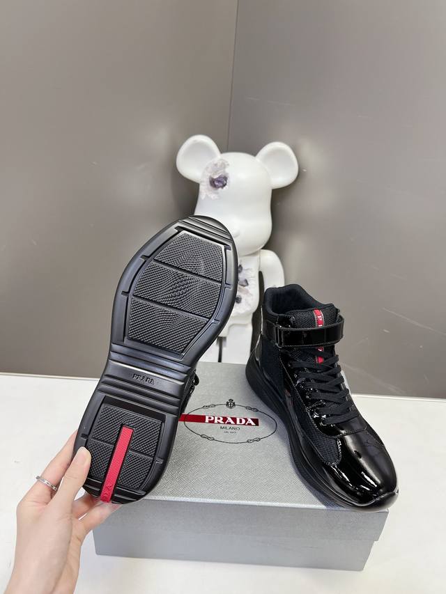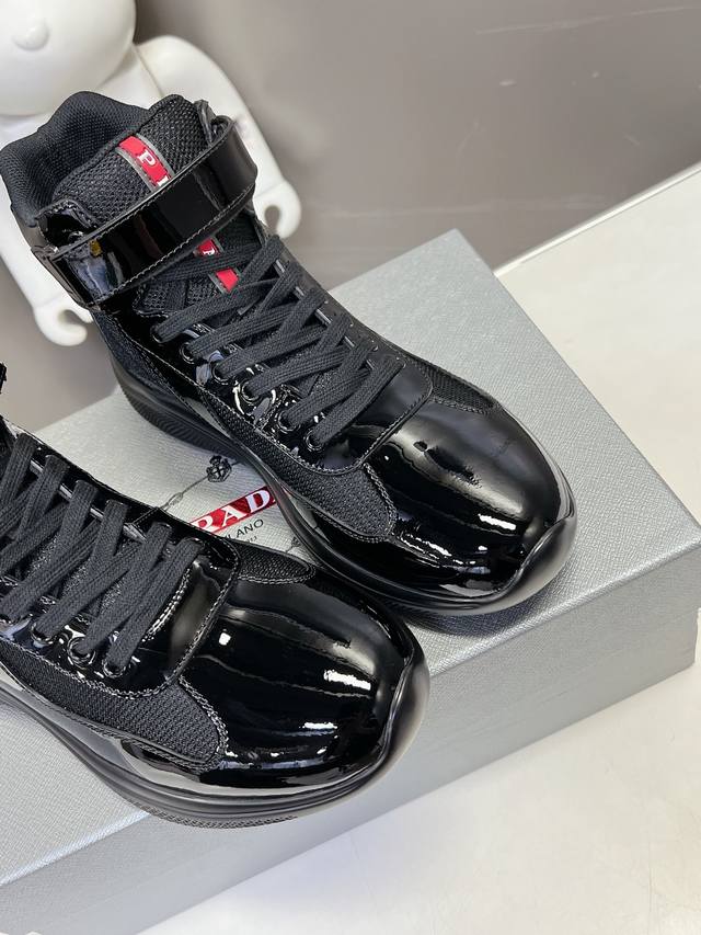 普拉达Prada顶级版高帮运动鞋 鞋面进口飞织面料拼接漆皮, 羊皮内里+牛皮踮脚, 耐磨防滑轻便大底, 男女同款: 码数:35-45码