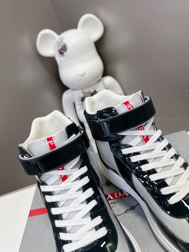 普拉达Prada顶级版高帮运动鞋 鞋面进口飞织面料拼接漆皮, 羊皮内里+牛皮踮脚, 耐磨防滑轻便大底, 男女同款: 码数:35-45码