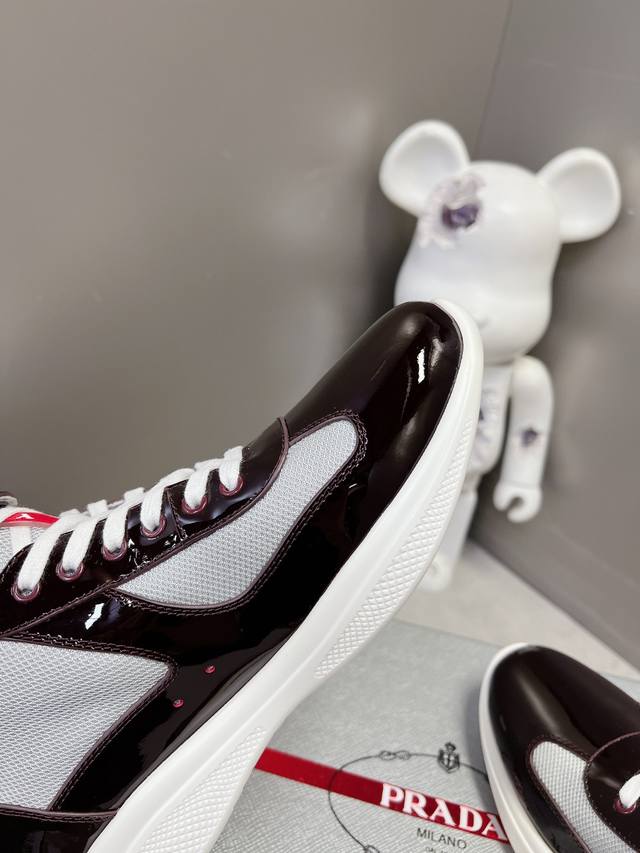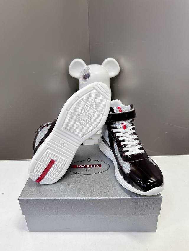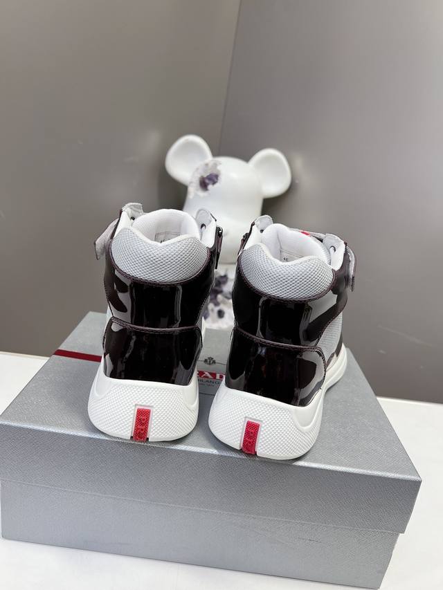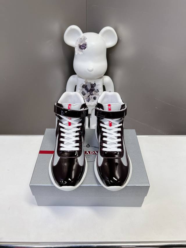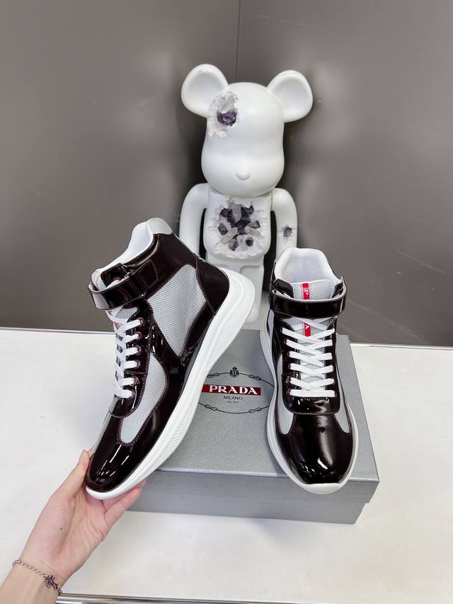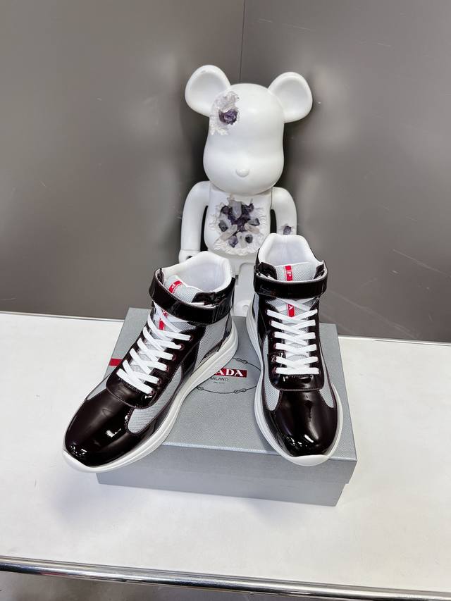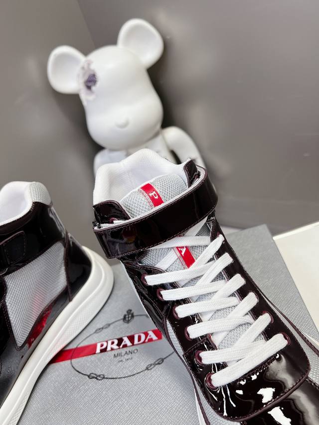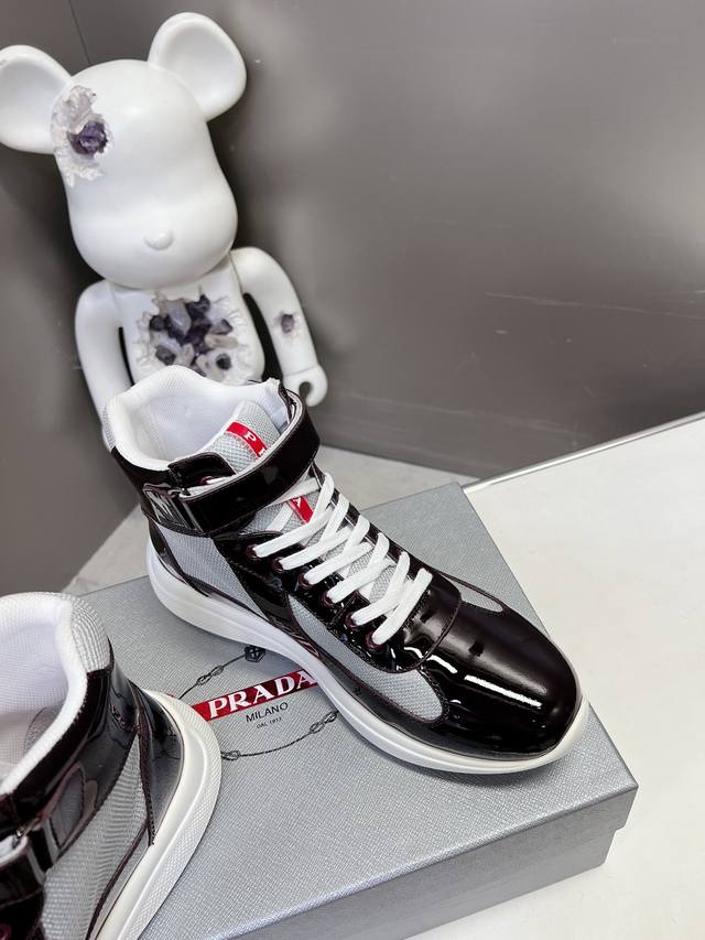 普拉达Prada顶级版高帮运动鞋 鞋面进口飞织面料拼接漆皮, 羊皮内里+牛皮踮脚, 耐磨防滑轻便大底, 男女同款: 码数:35-45码