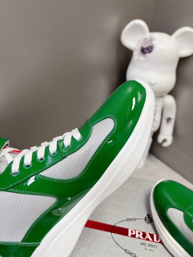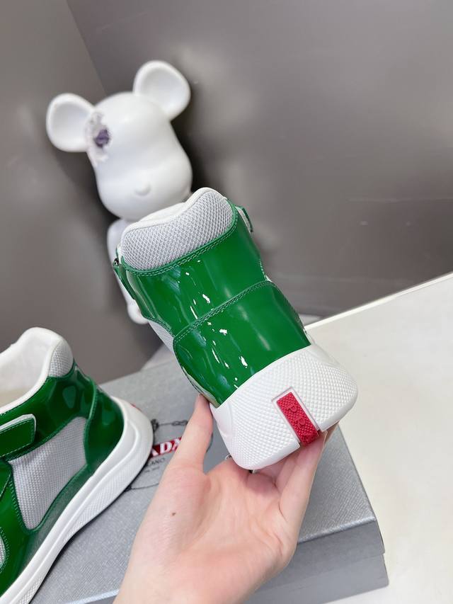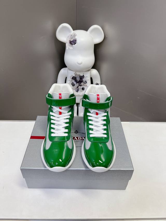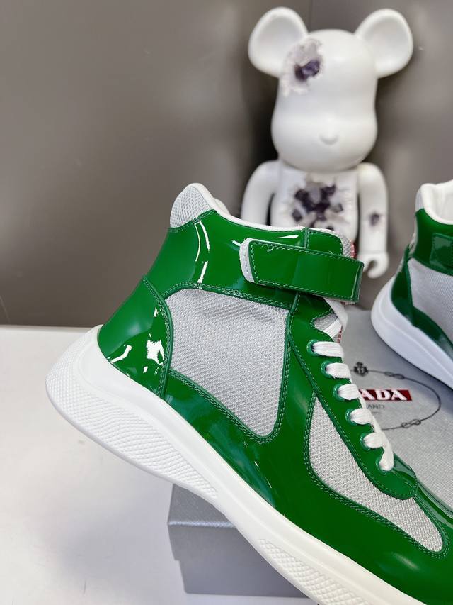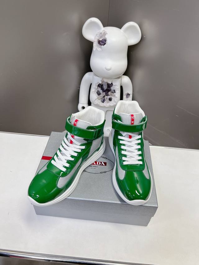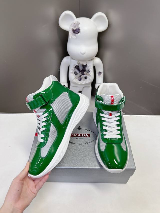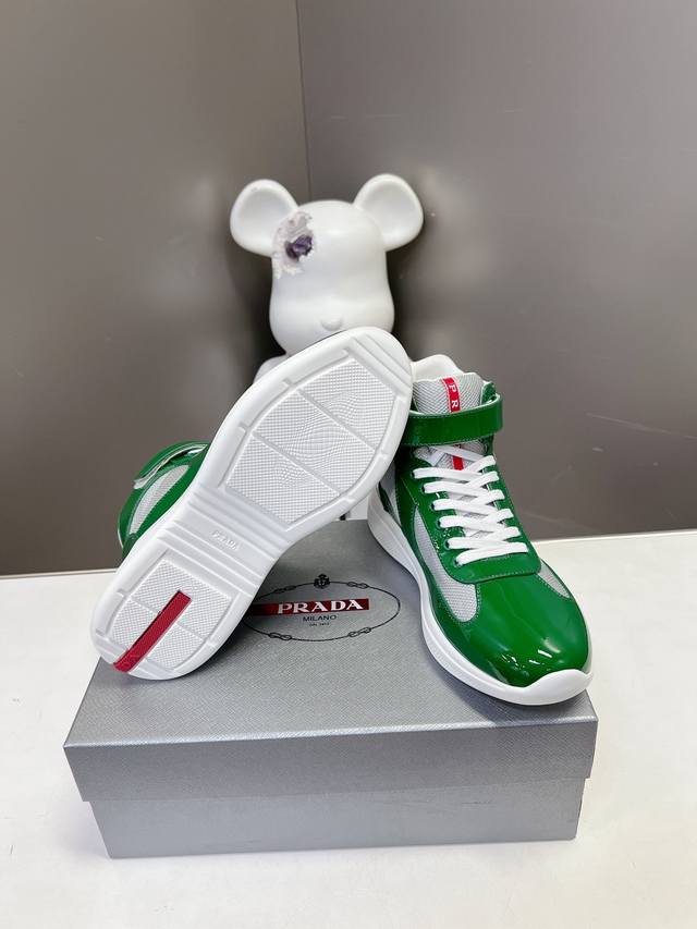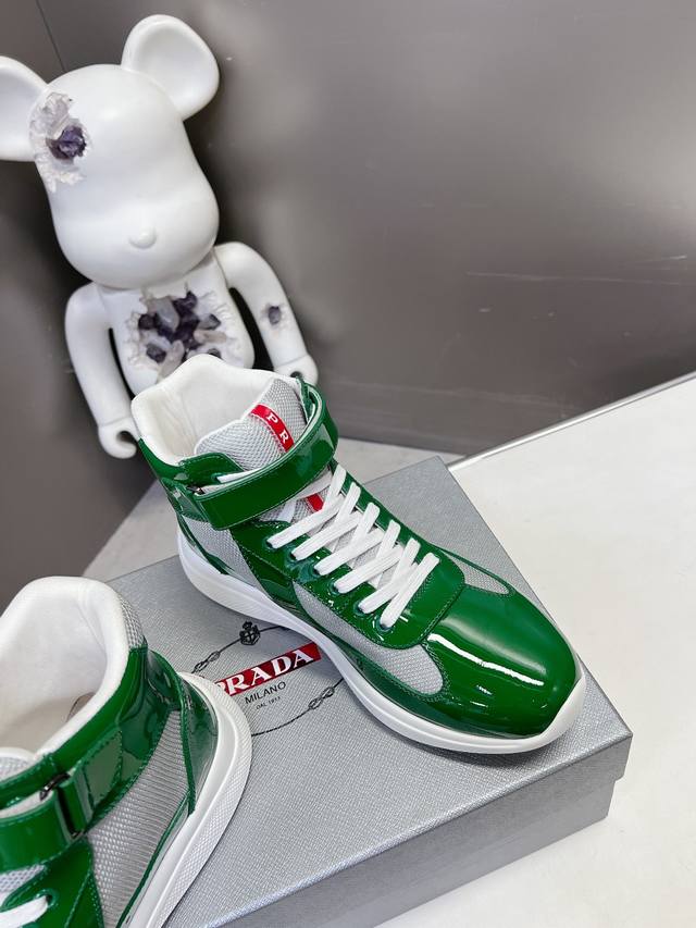 普拉达Prada顶级版高帮运动鞋 鞋面进口飞织面料拼接漆皮, 羊皮内里+牛皮踮脚, 耐磨防滑轻便大底, 男女同款: 码数:35-45码