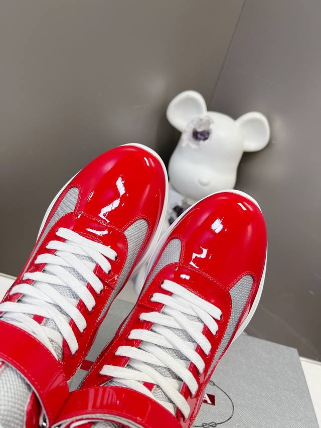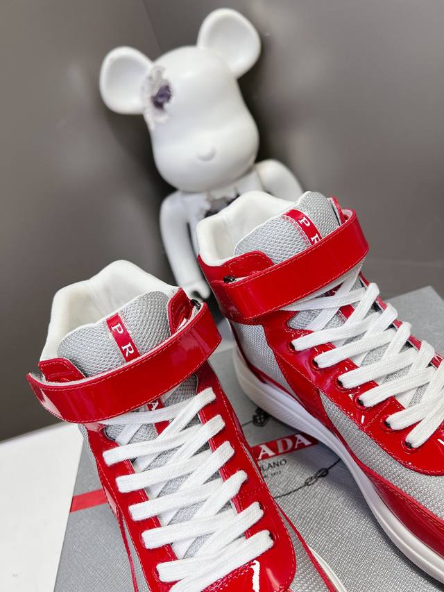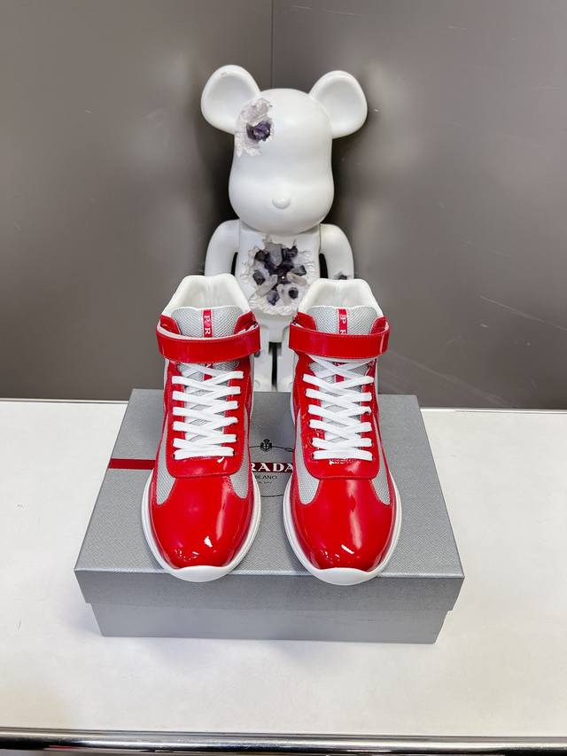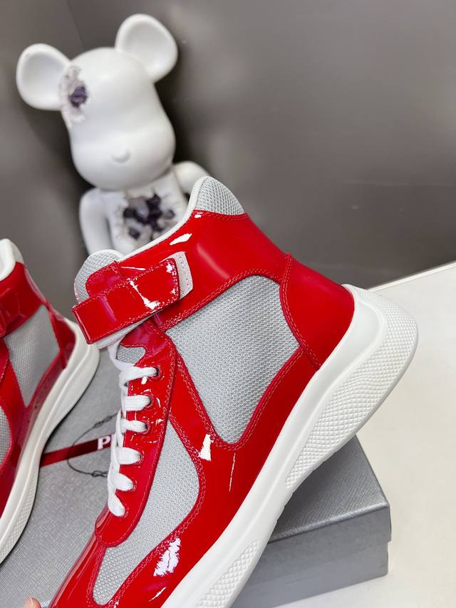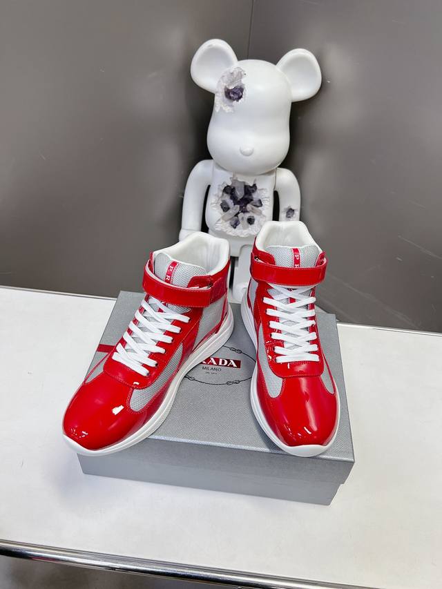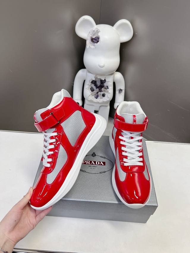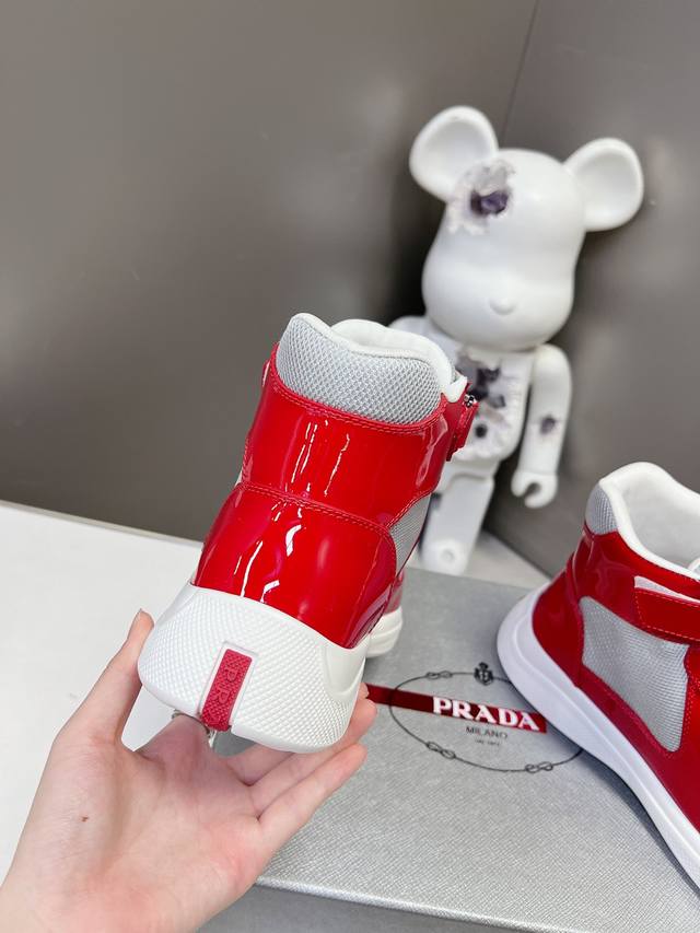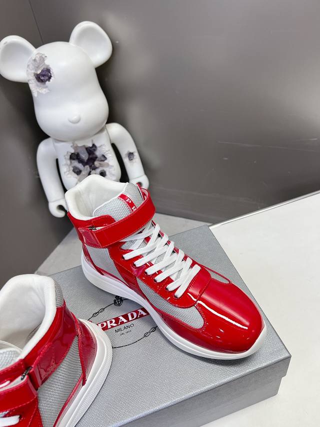 普拉达Prada顶级版高帮运动鞋 鞋面进口飞织面料拼接漆皮, 羊皮内里+牛皮踮脚, 耐磨防滑轻便大底, 男女同款: 码数:35-45码